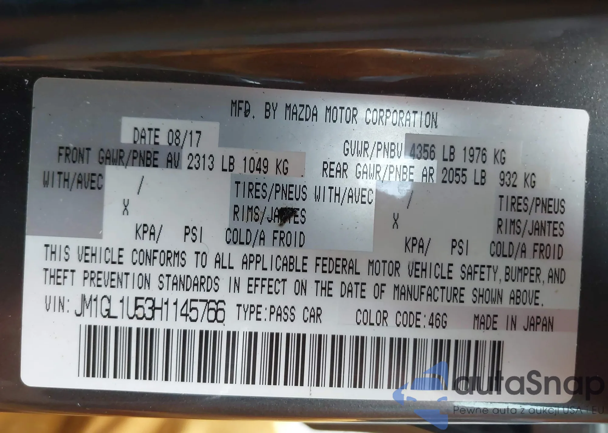 LOT: 42220662 VIN: JM1GL1U53H1145766