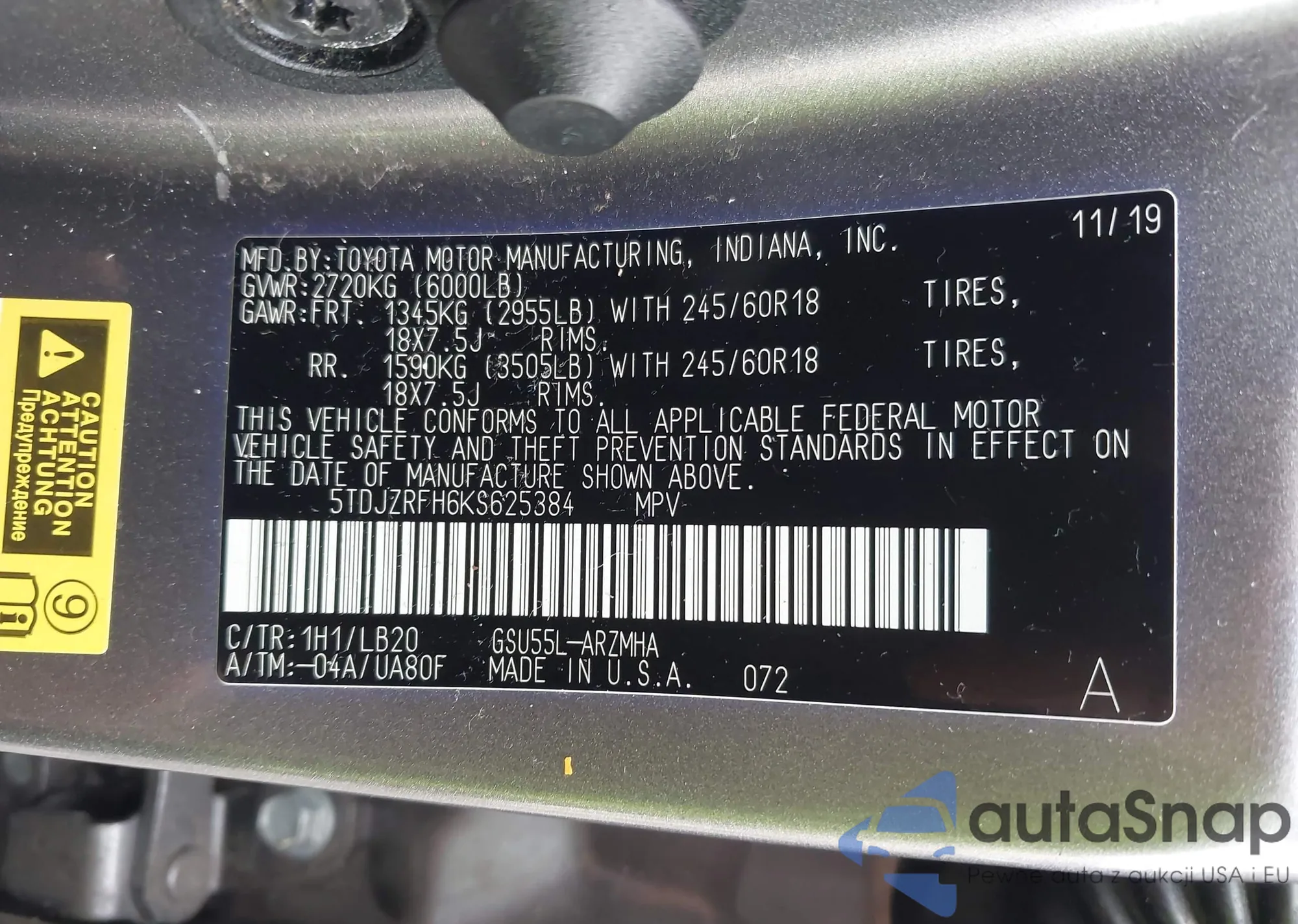 LOT: 43017936 VIN: 5TDJZRFH6KS625384