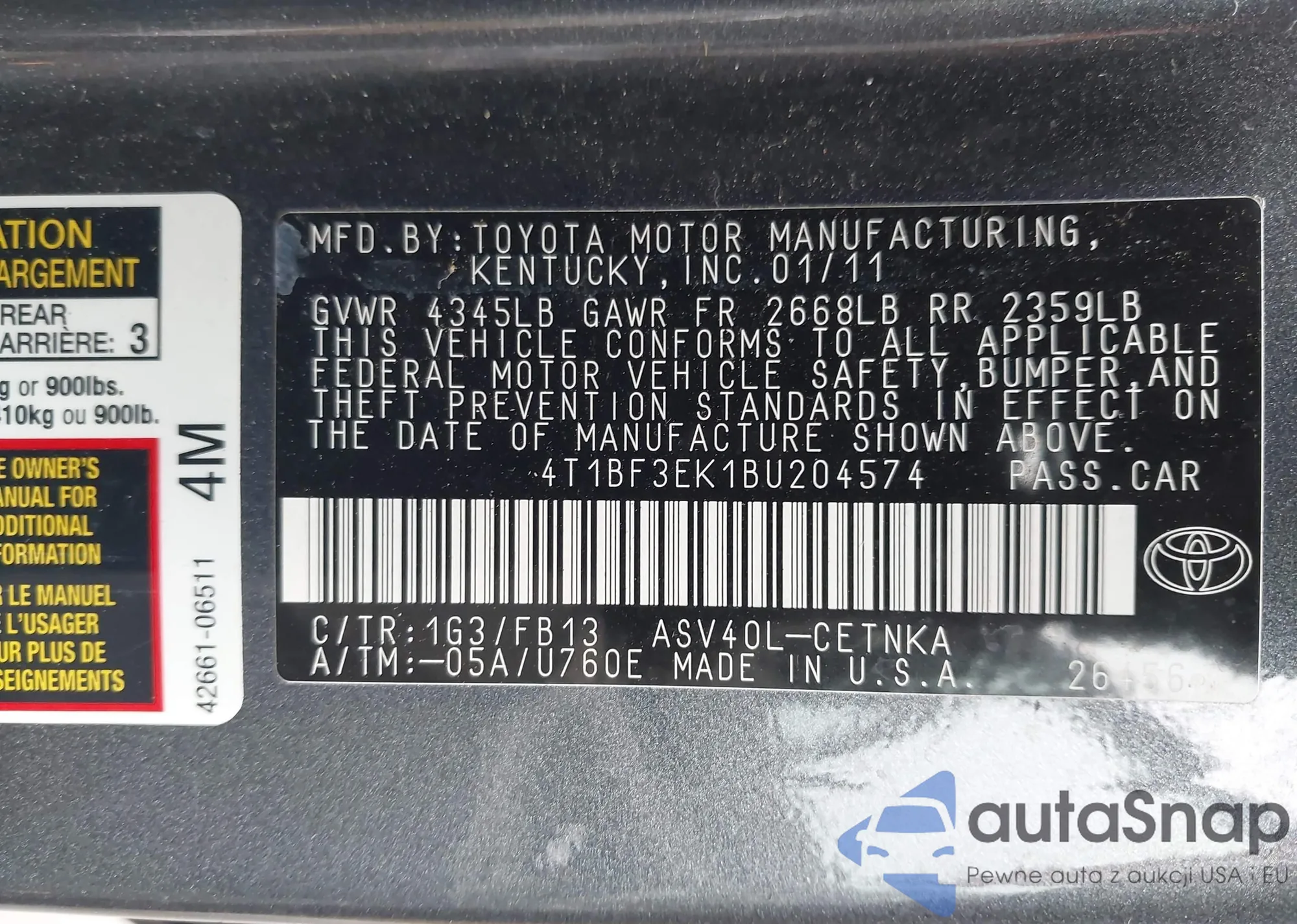 • VIN 4T1BF3EK1BU204574