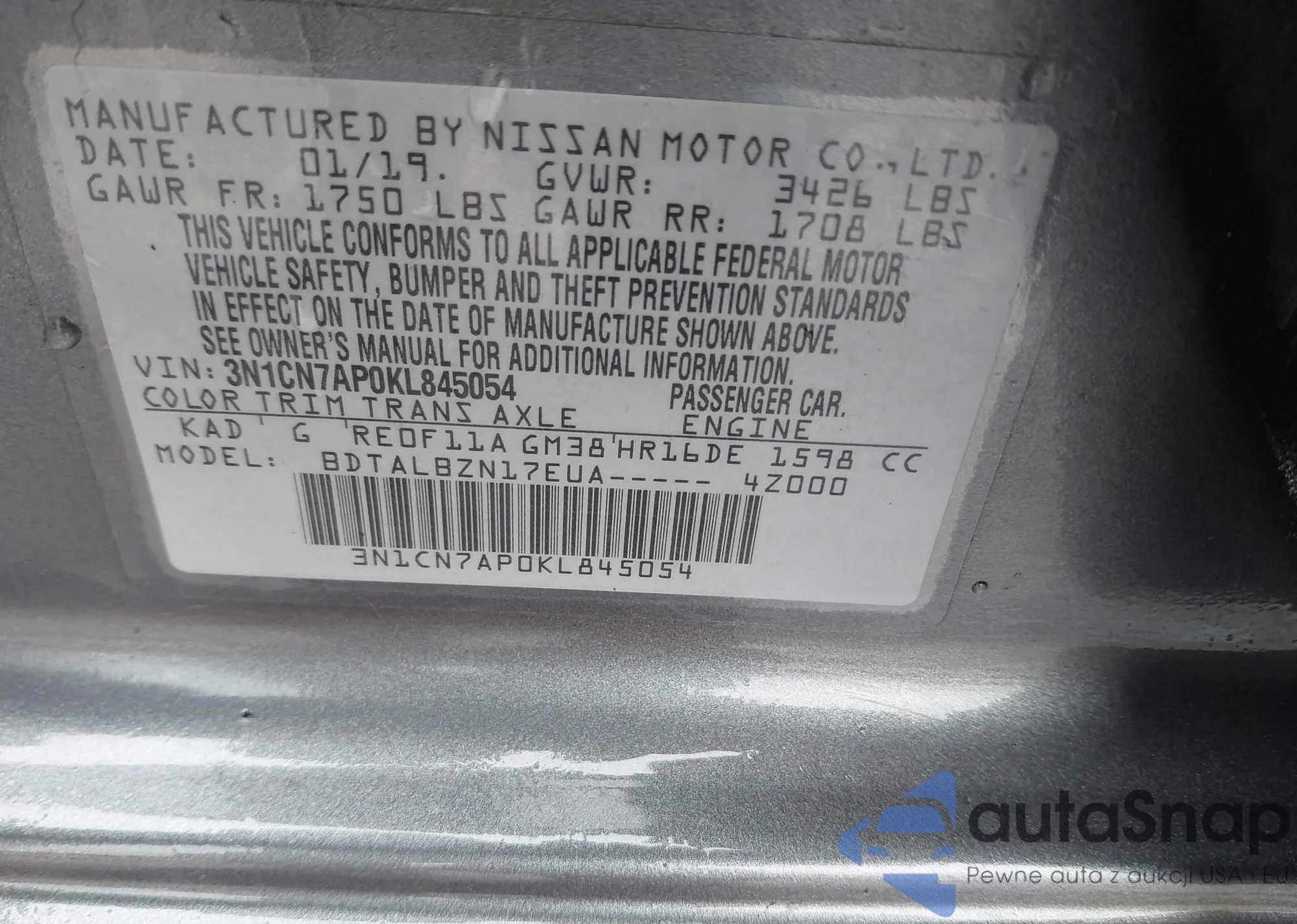 LOT: 42425701 VIN: 3N1CN7AP0KL845054