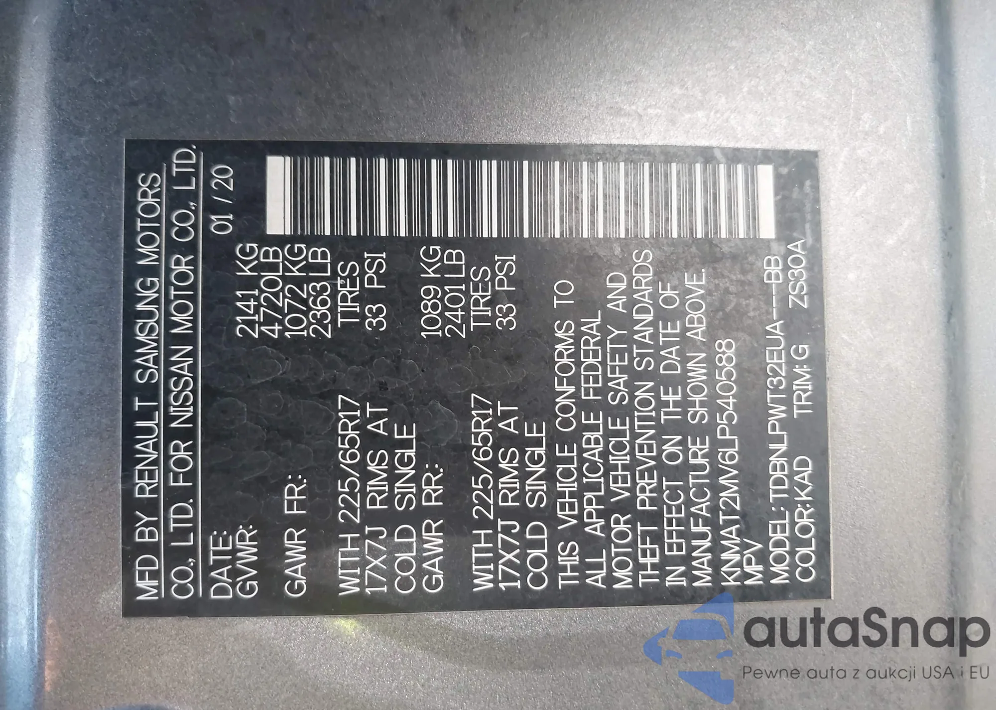 LOT: 42717355 VIN: KNMAT2MV6LP540588