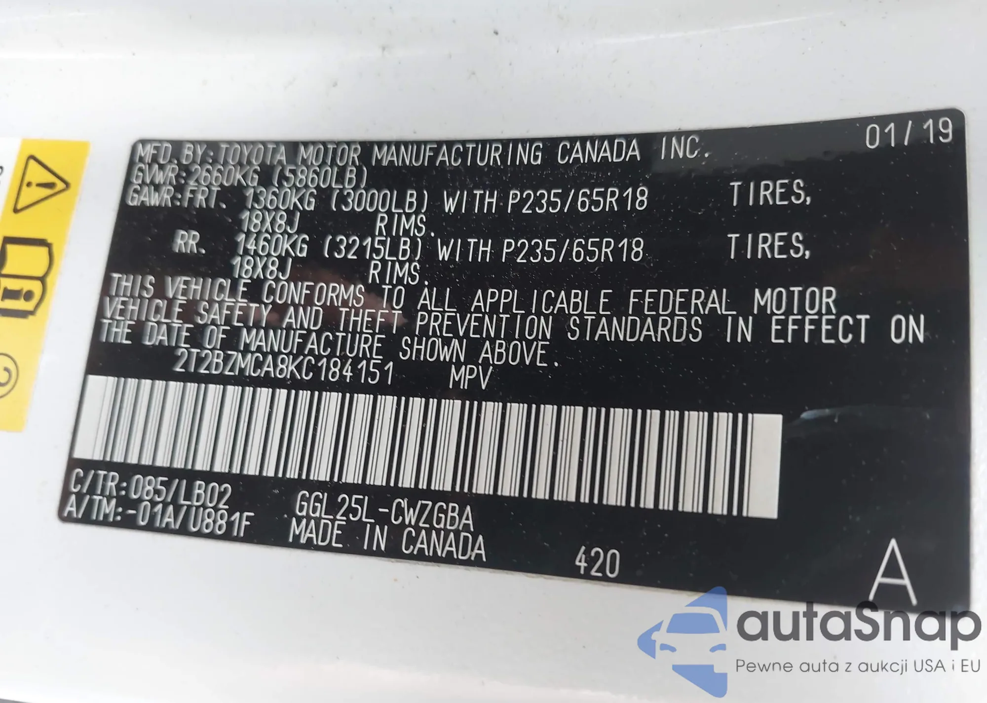 LOT: 42952283 VIN: 2T2BZMCA8KC184151