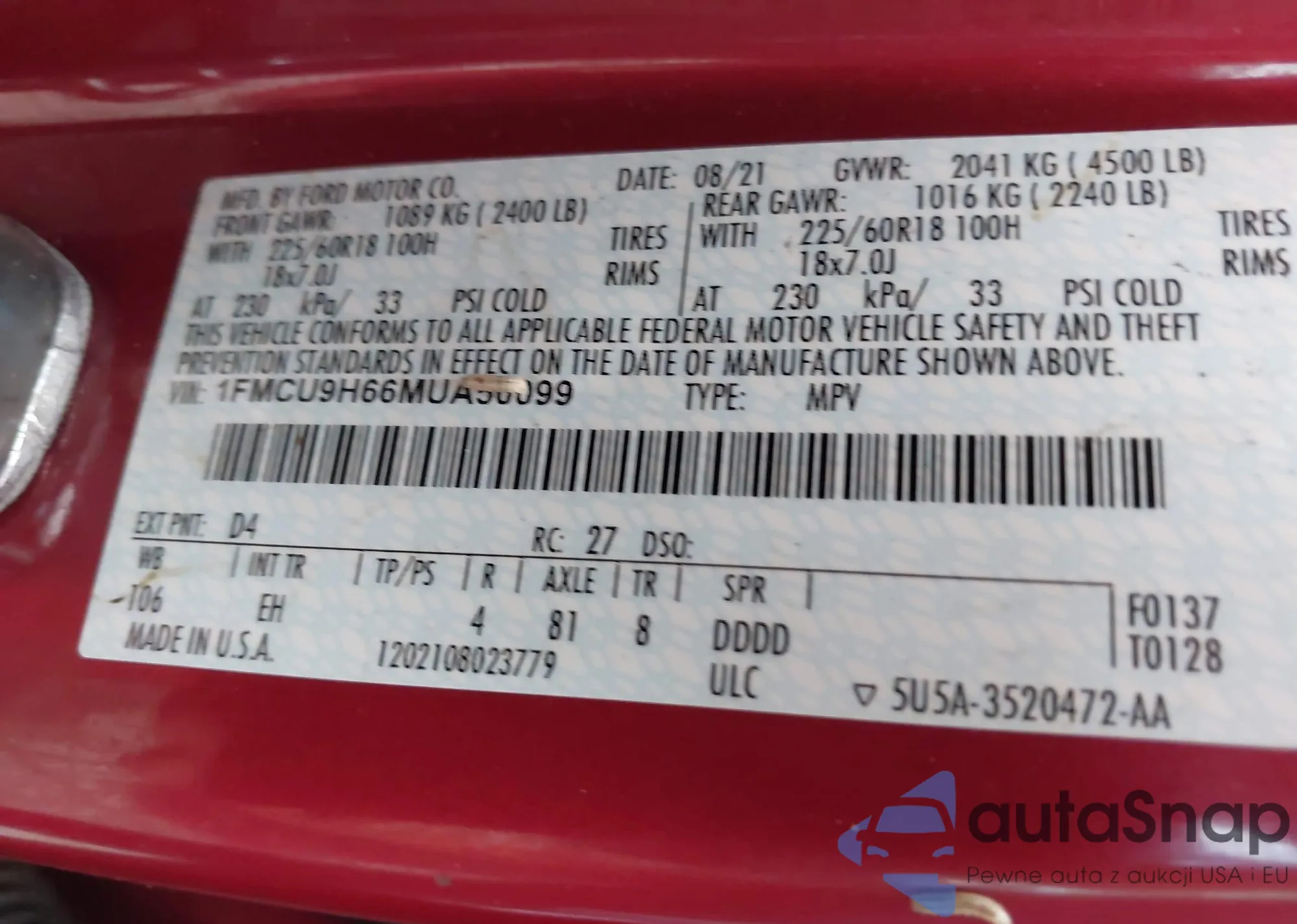 LOT: 42959090 VIN: 1FMCU9H66MUA50099