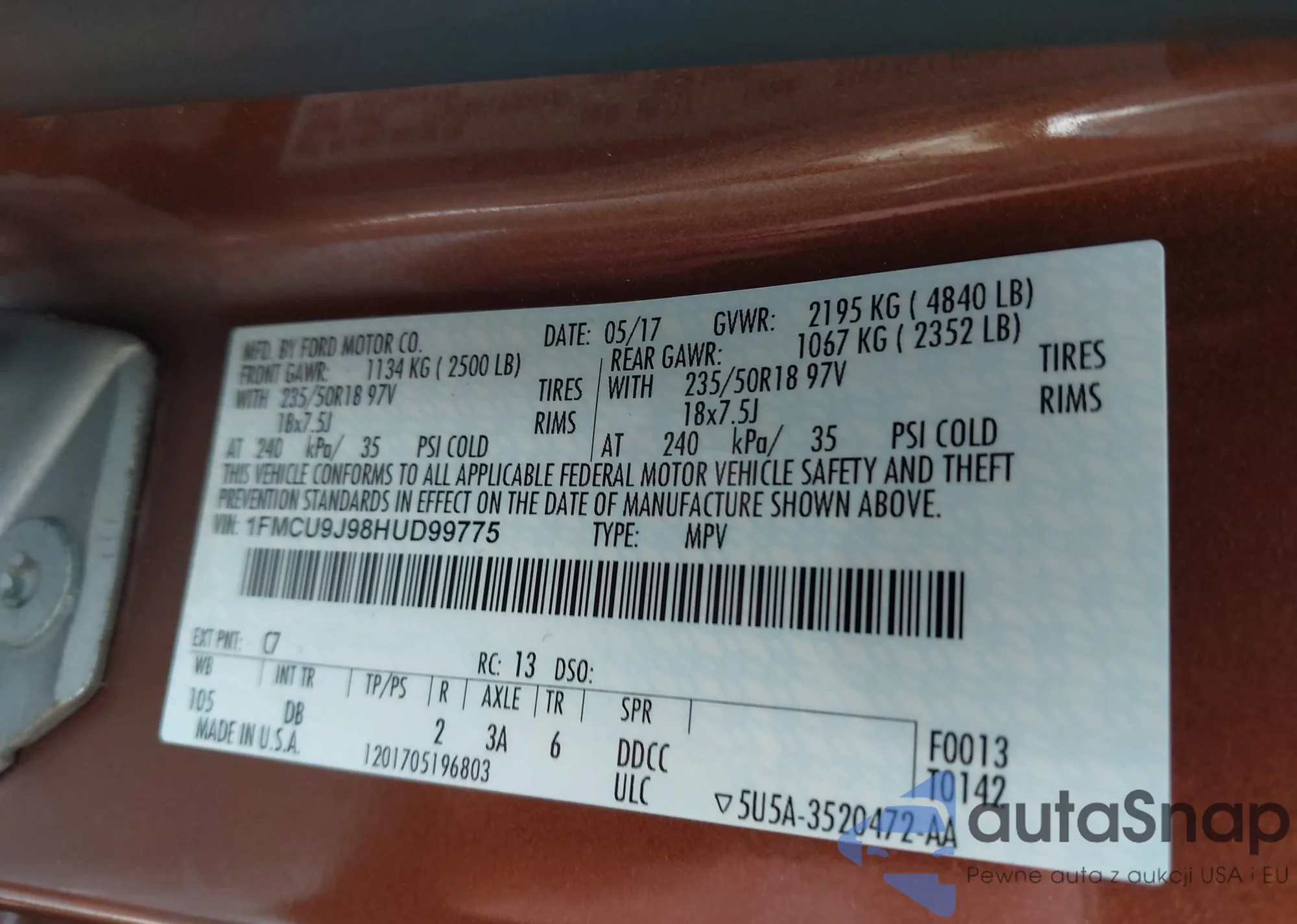 • VIN 1FMCU9J98HUD99775