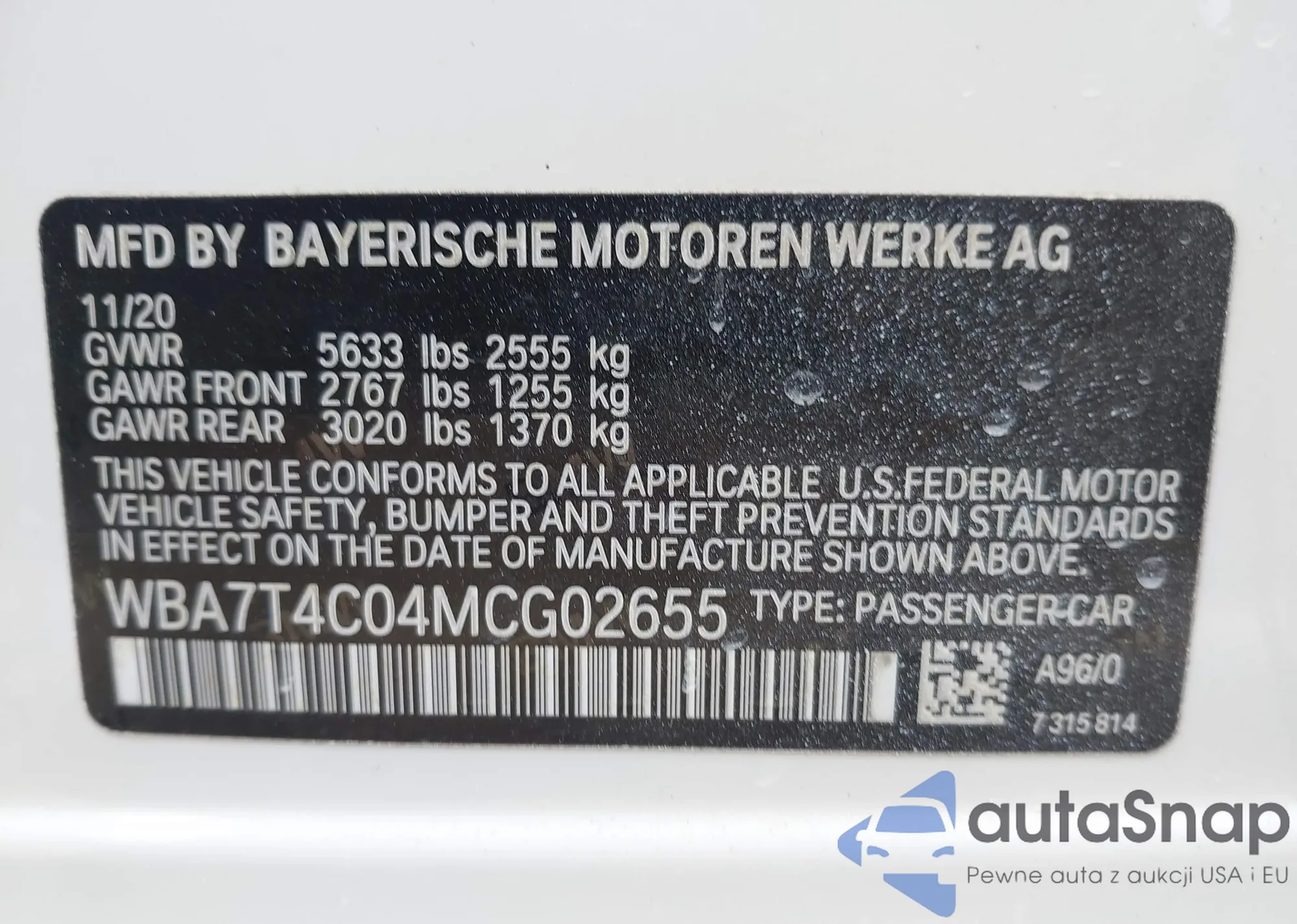 LOT: 42846330 VIN: WBA7T4C04MCG02655