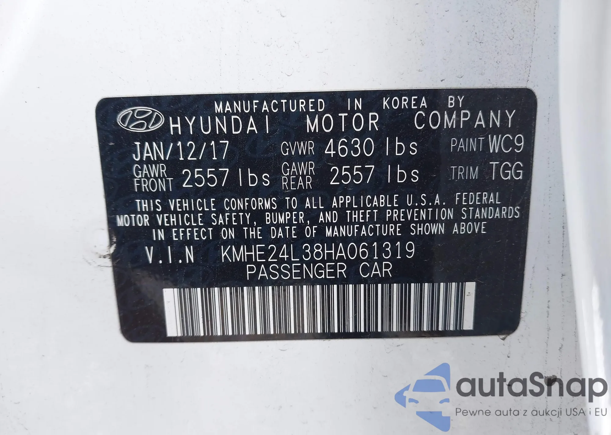 LOT: 43084229 VIN: KMHE24L38HA061319