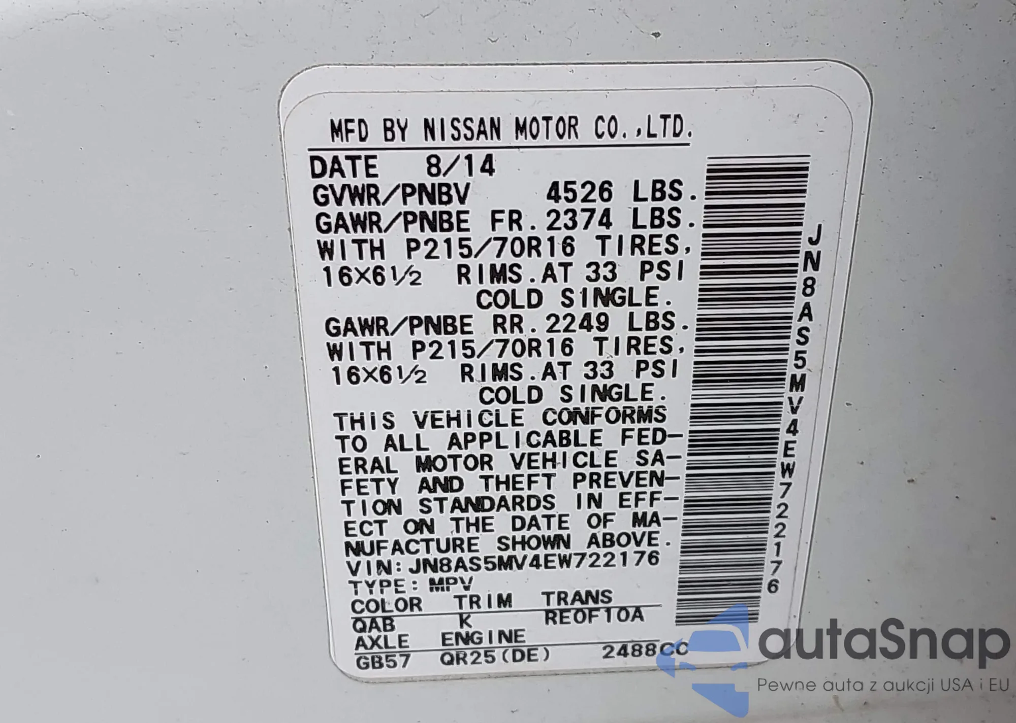 • VIN JN8AS5MV4EW722176