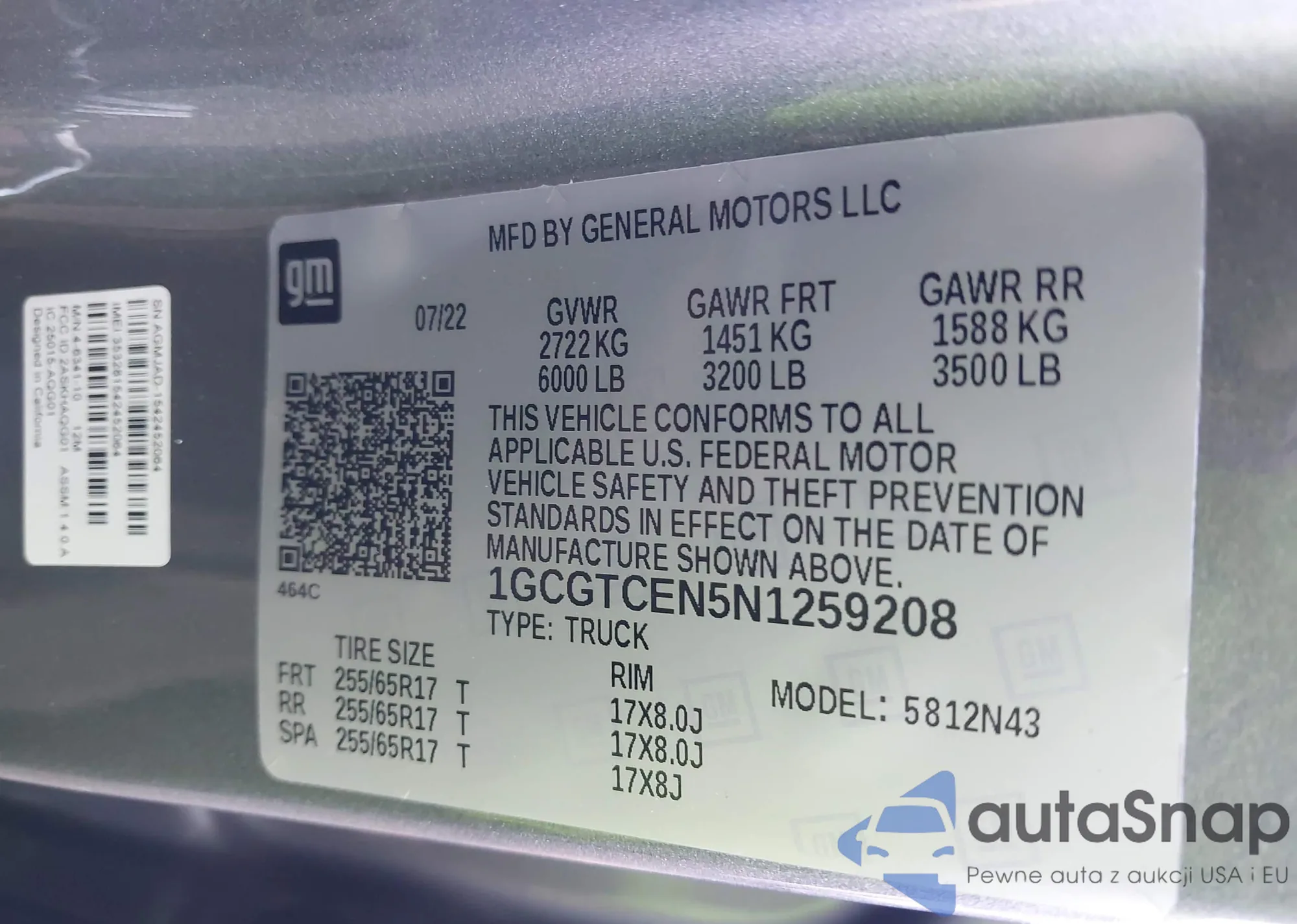 LOT: 42852510 VIN: 1GCGTCEN5N1259208