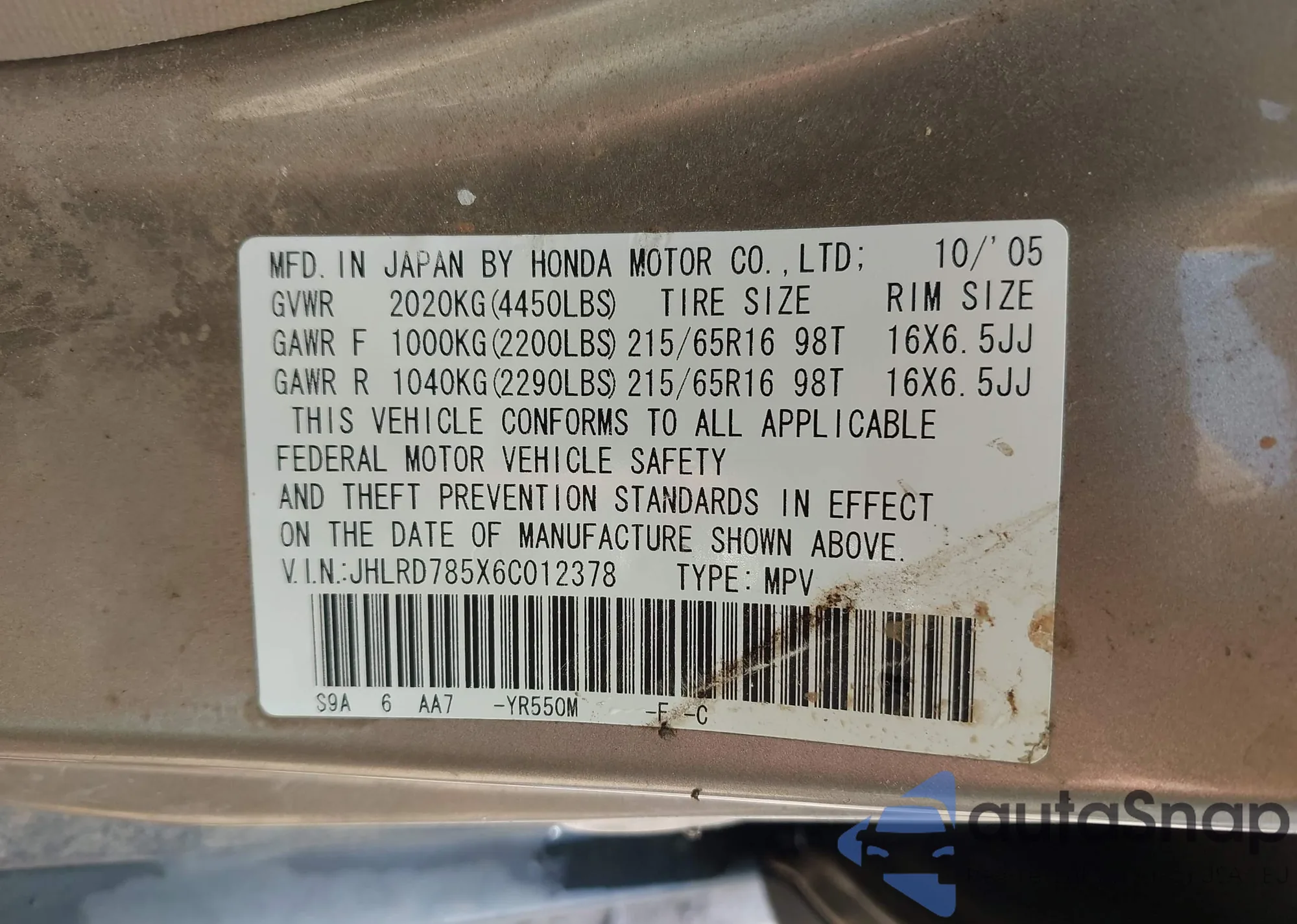 LOT: 42624468 VIN: JHLRD785X6C012378