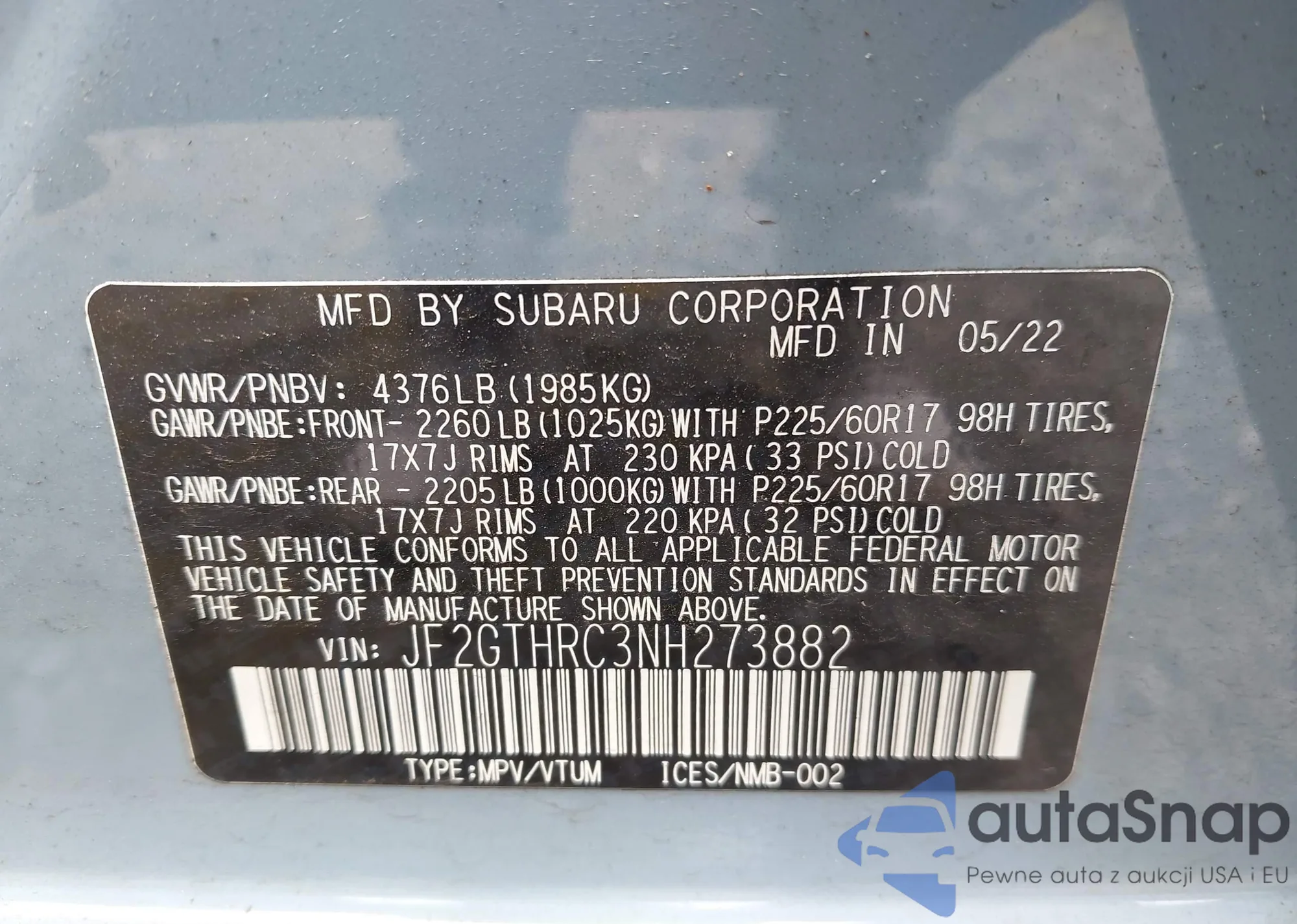 LOT: 42035982 VIN: JF2GTHRC3NH273882