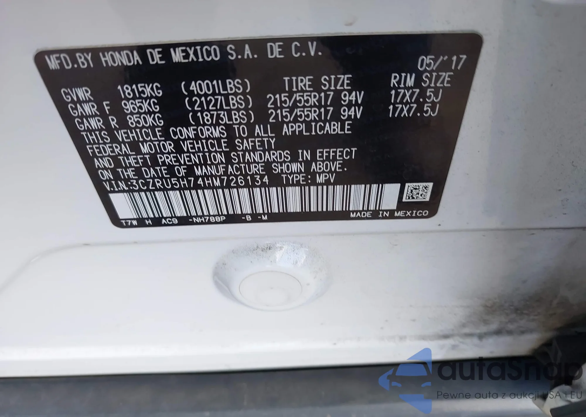 • VIN 1HGCR2F37HA054709