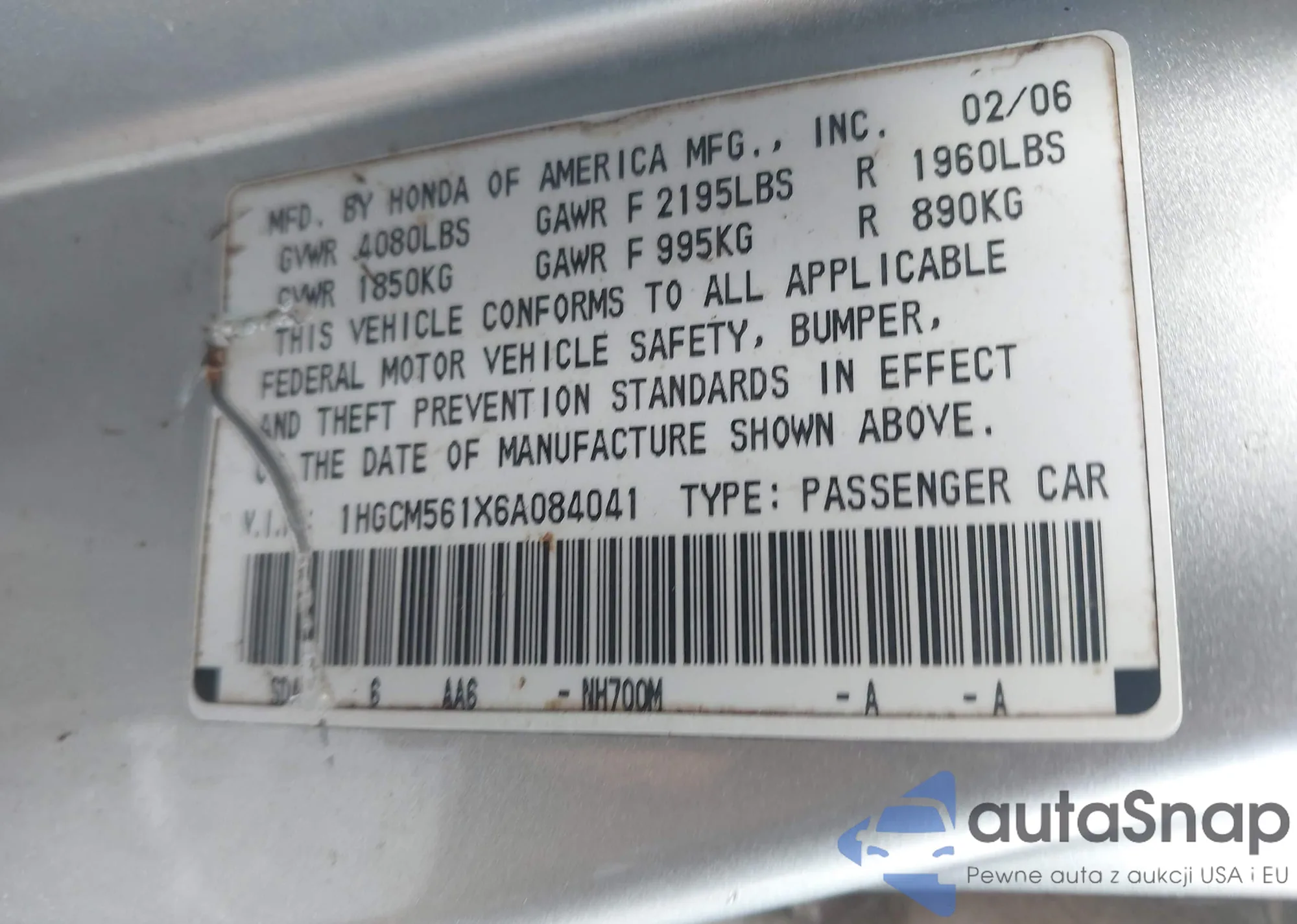 LOT: 42465430 VIN: 1HGCR2F37HA054709