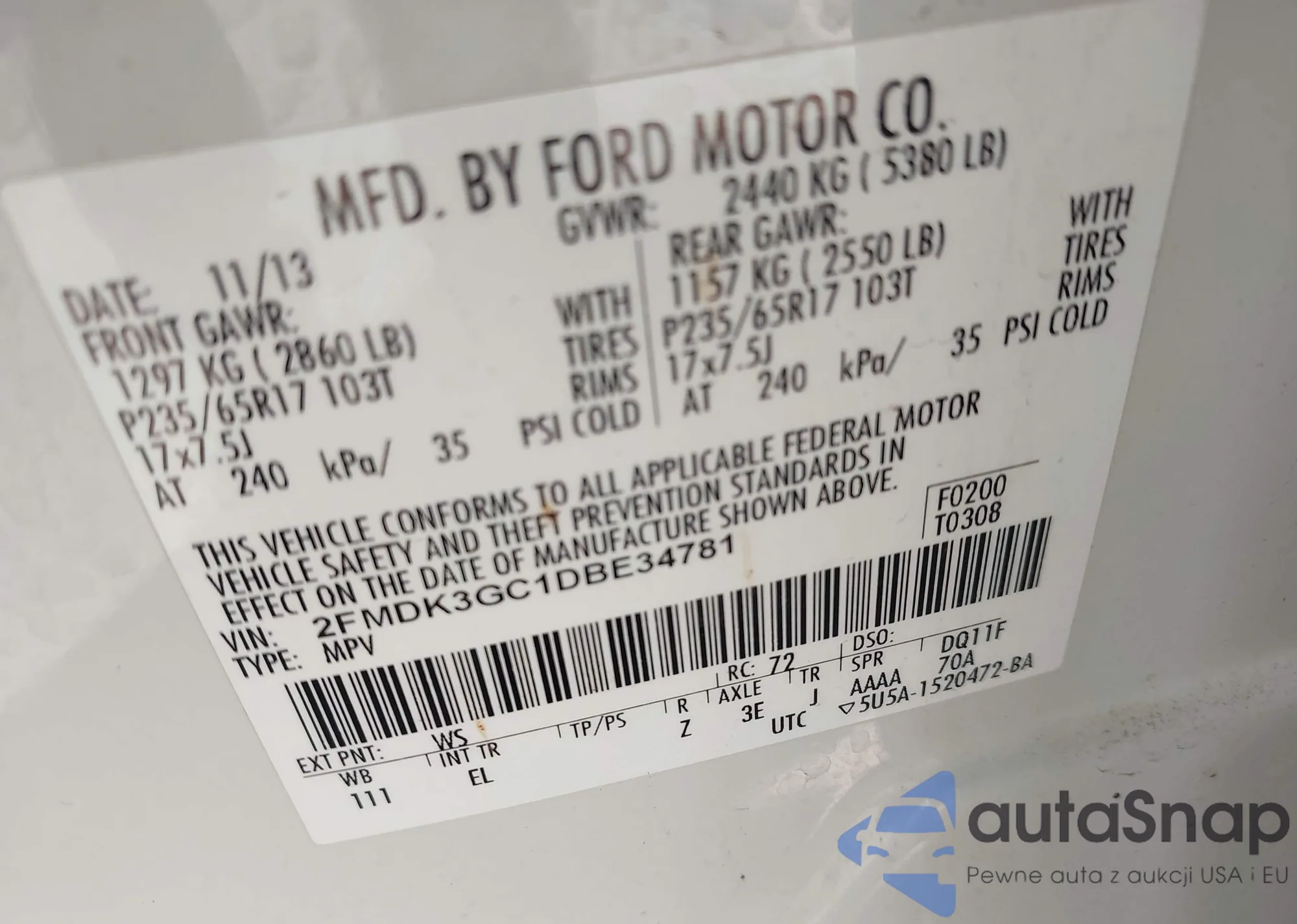 LOT: 42507807 VIN: 2FMDK3GC1DBE34781