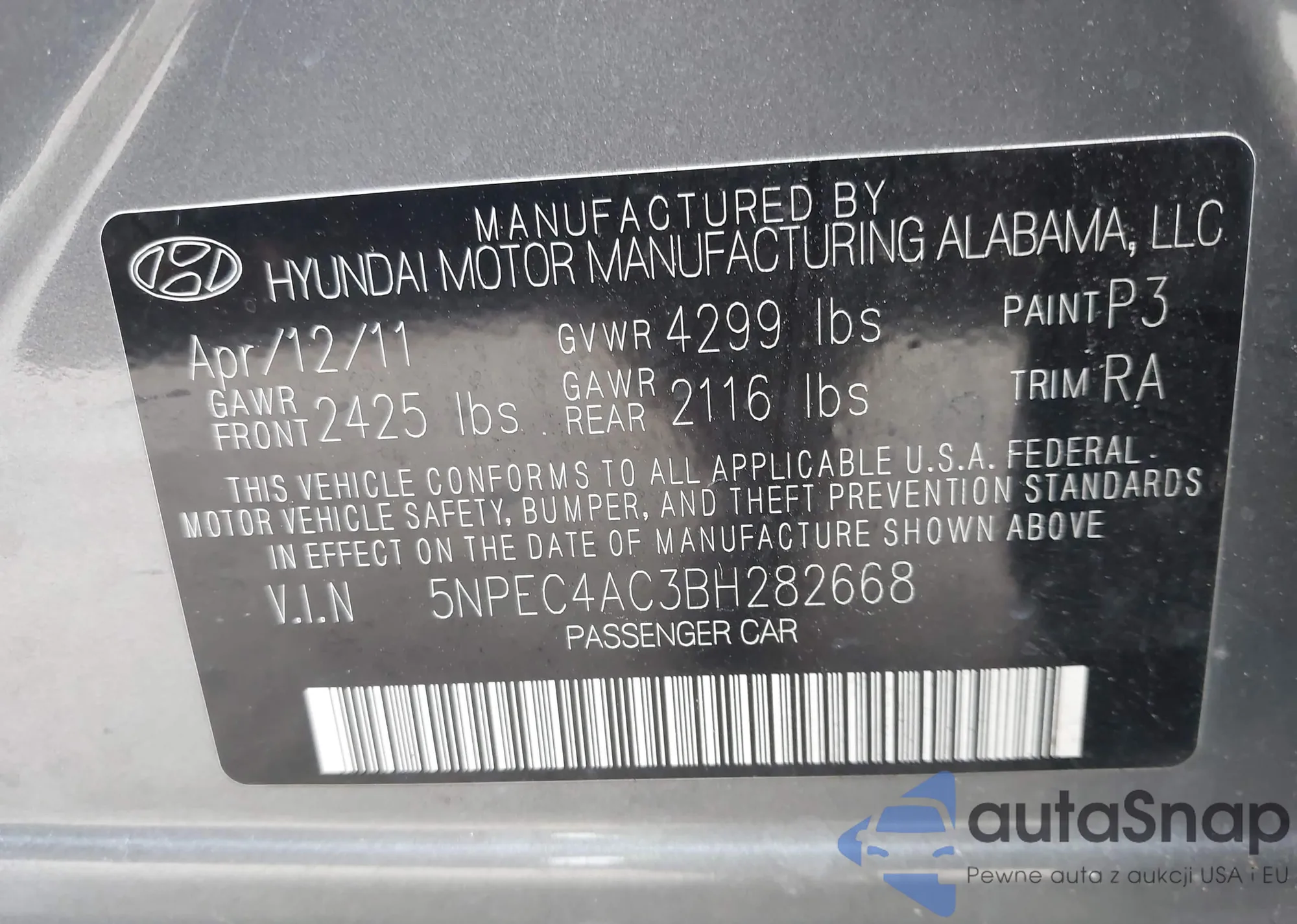 • VIN 5NPEC4AC3BH282668