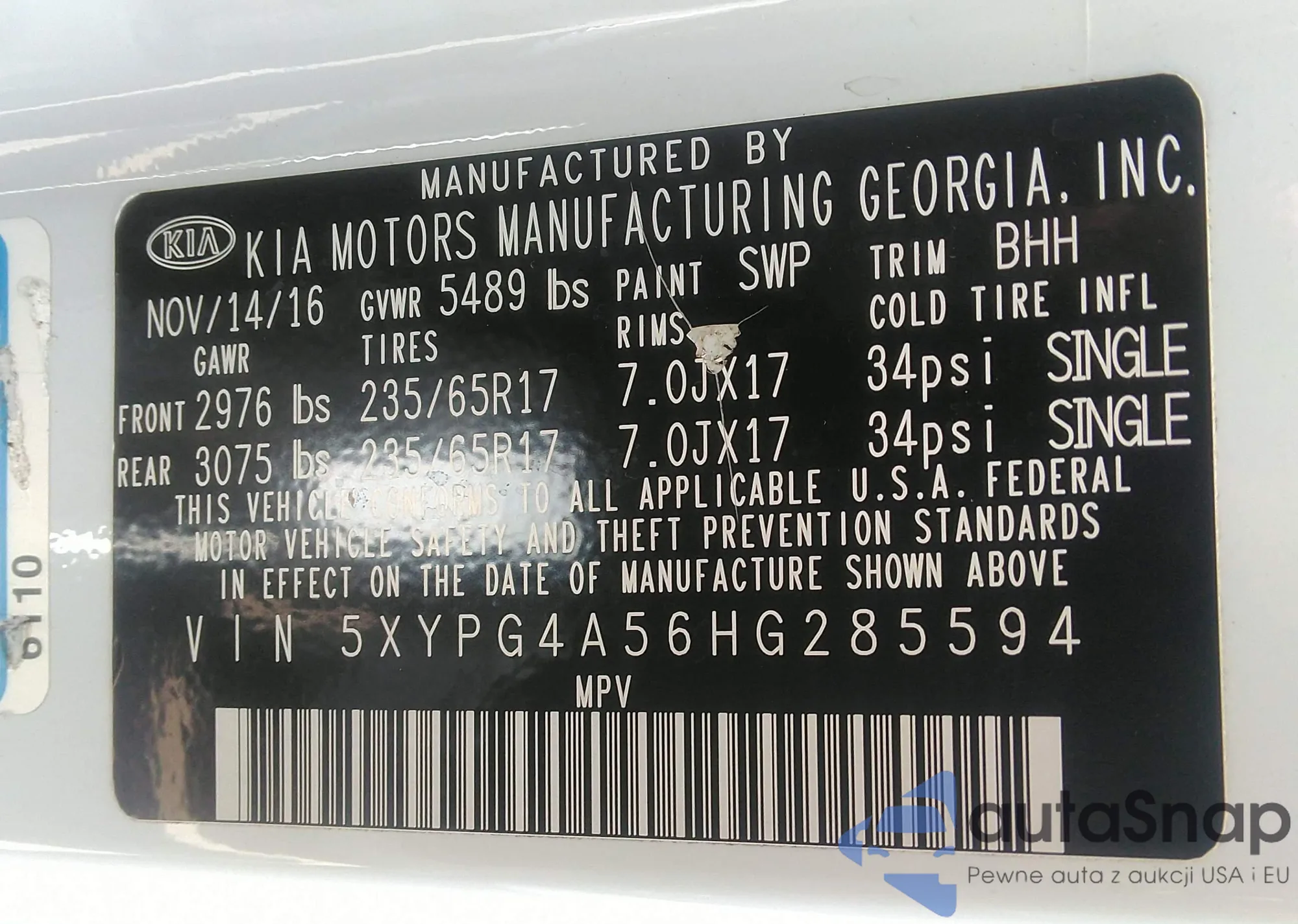 • VIN 5XYPG4A56HG285594
