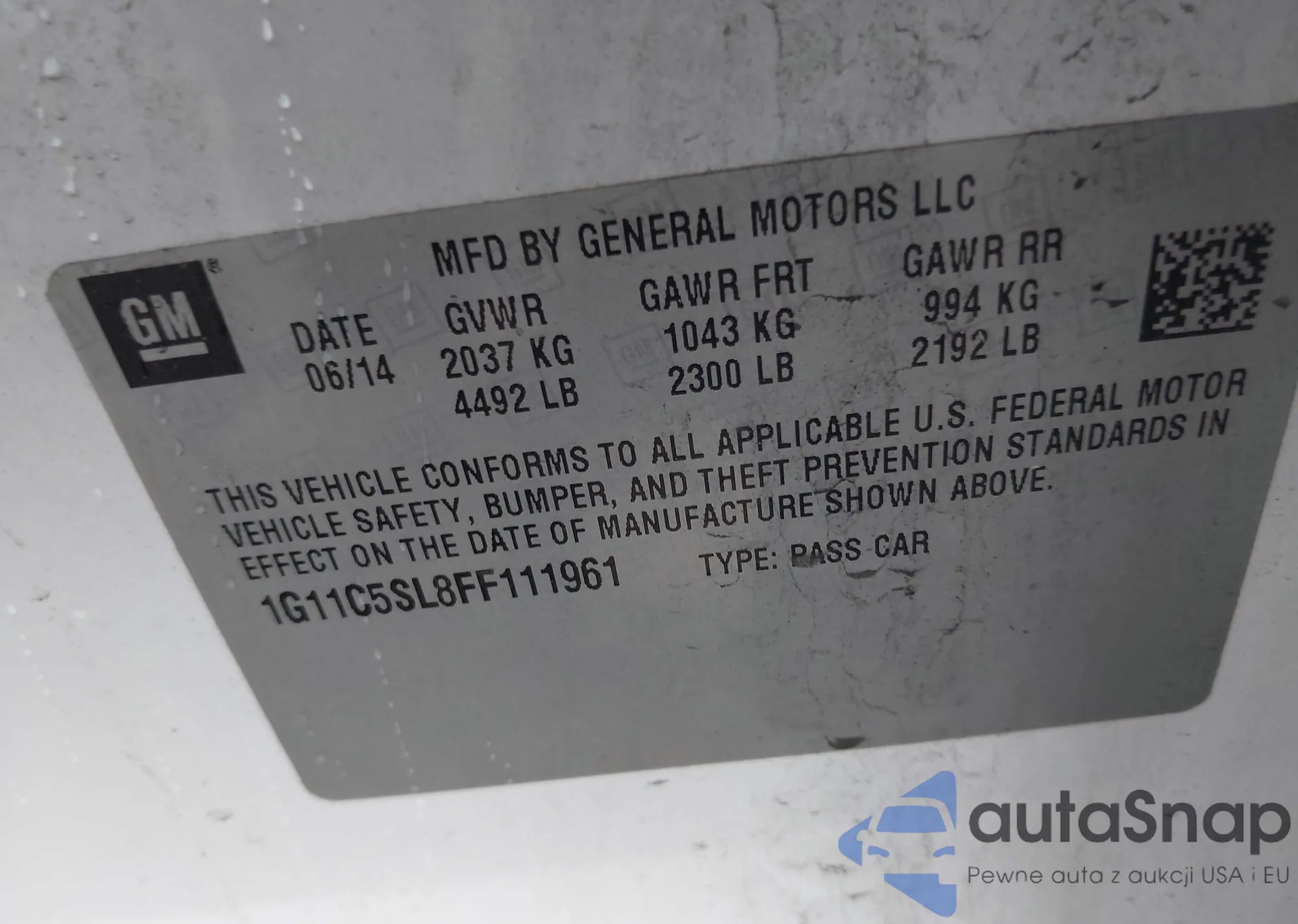 LOT: 42258186 VIN: 1G11C5SL8FF111961