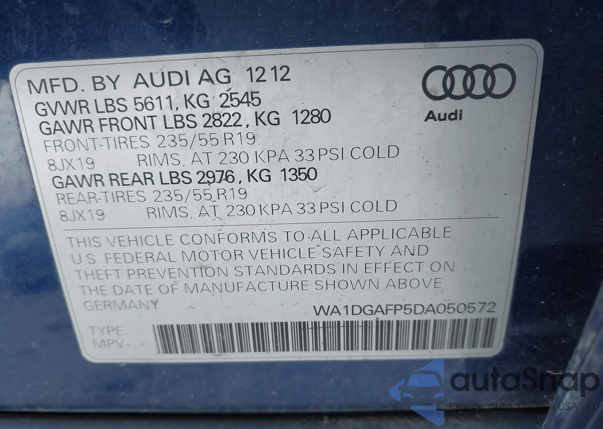 LOT: 43042553 VIN: WA1DGAFP5DA050572