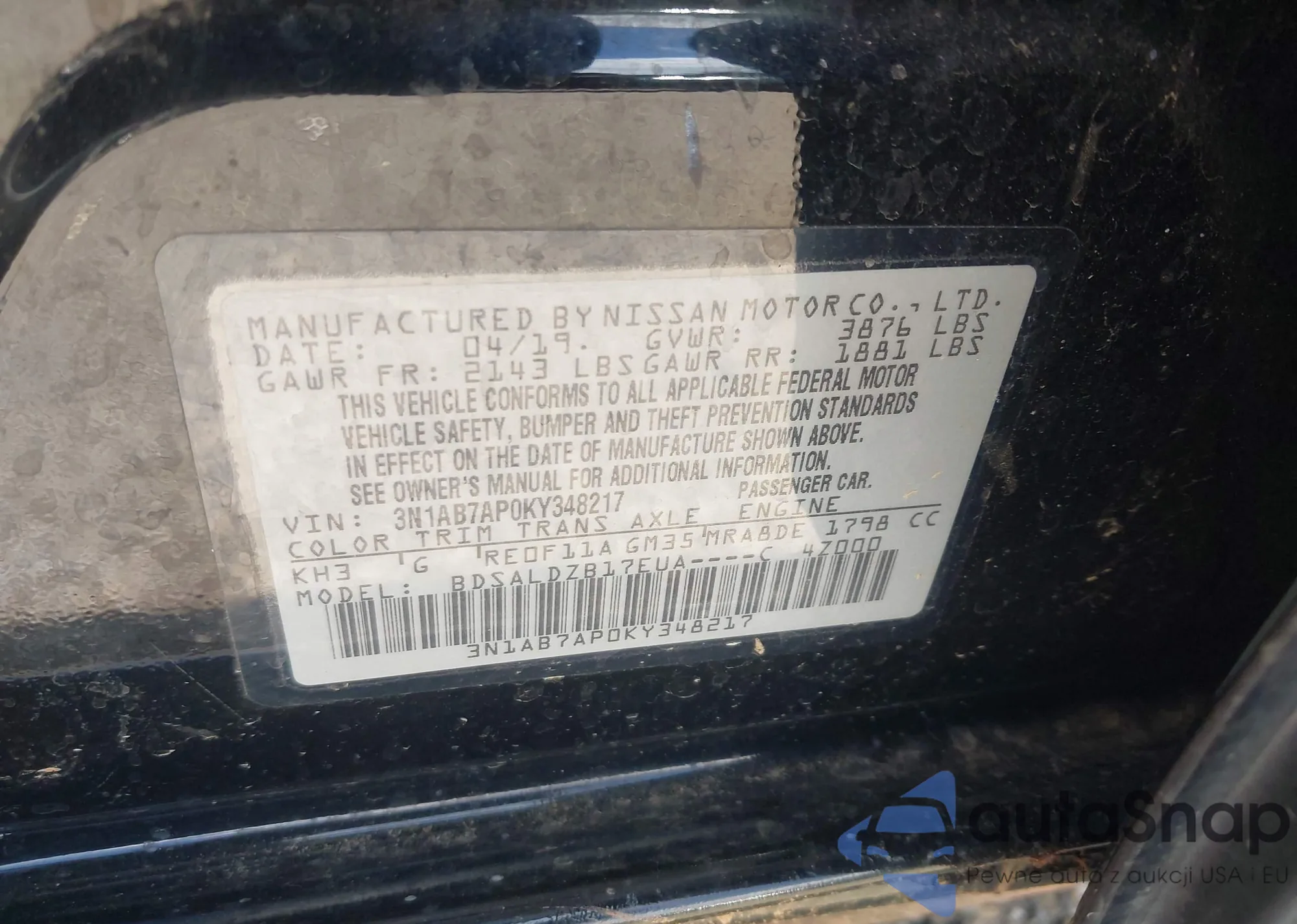 LOT: 42740723 VIN: 3N1AB7AP0KY348217