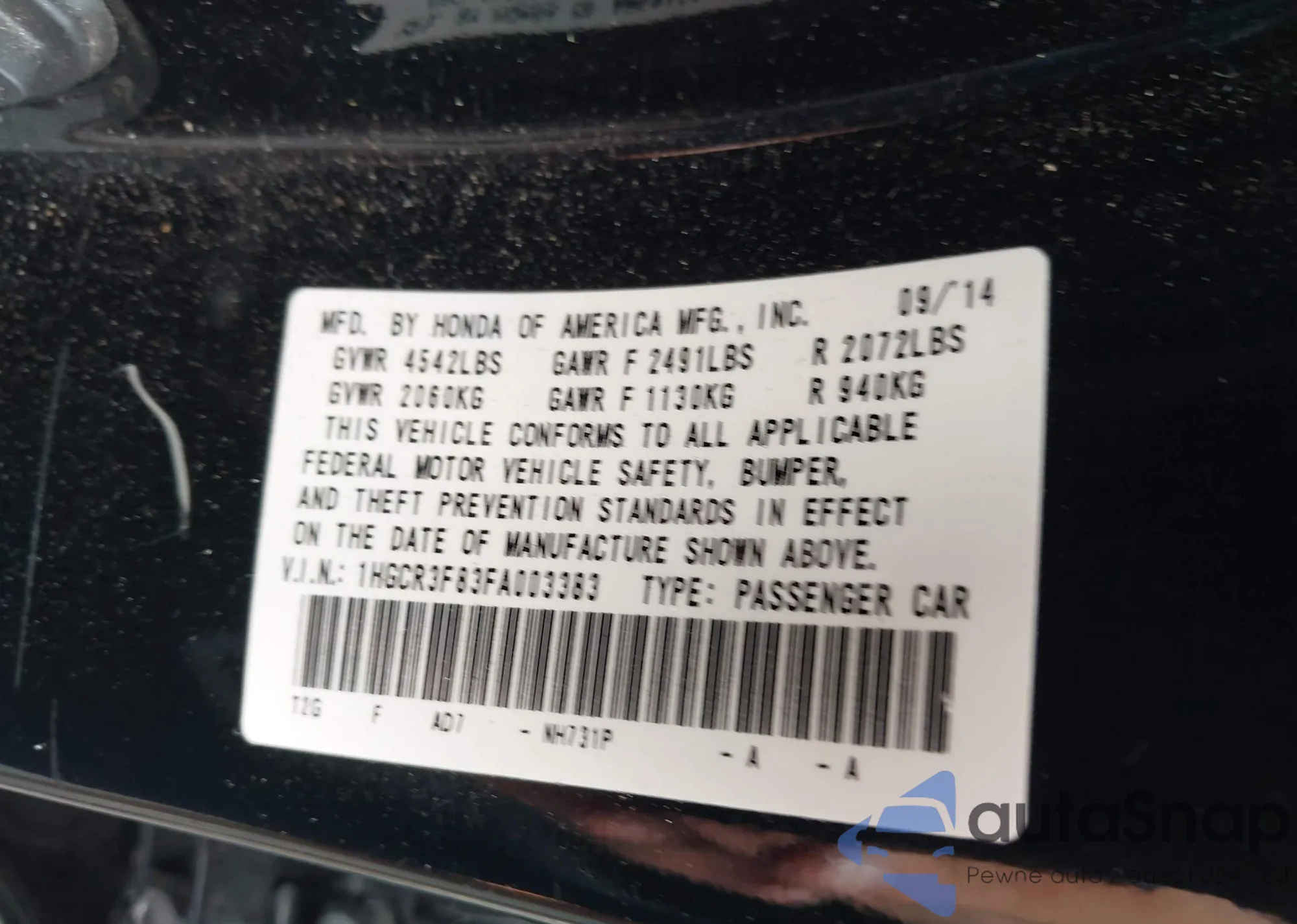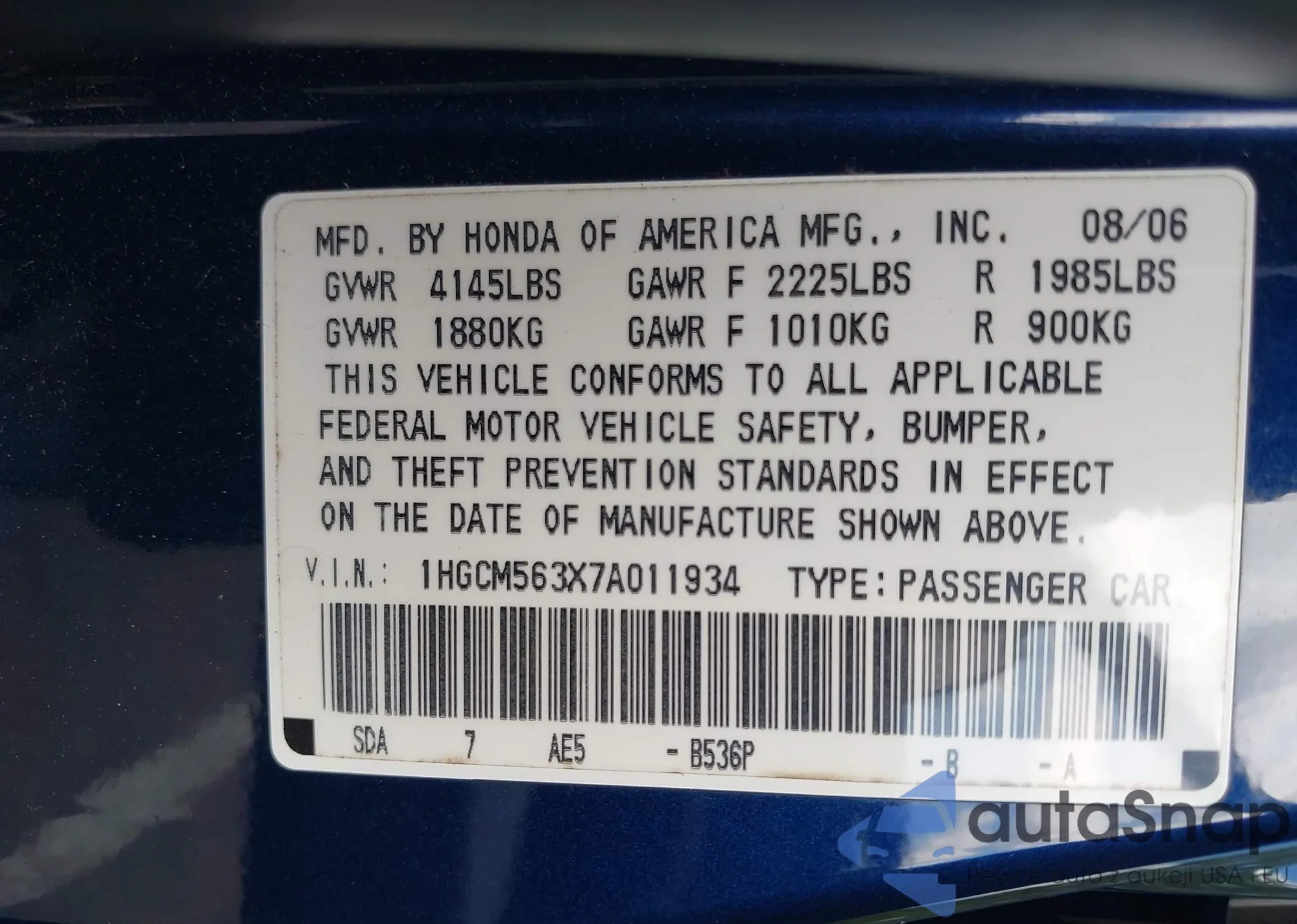 LOT: 42724634 VIN: 1HGCM563X7A011934