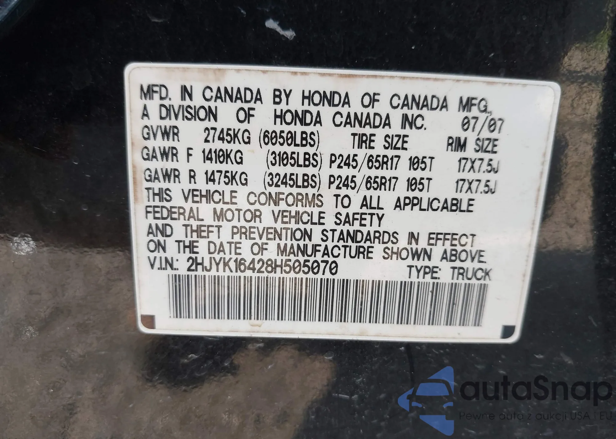 2007 Honda Accord 3.0 Ex from USA, damaged, VIN 1HGCM66817A058321