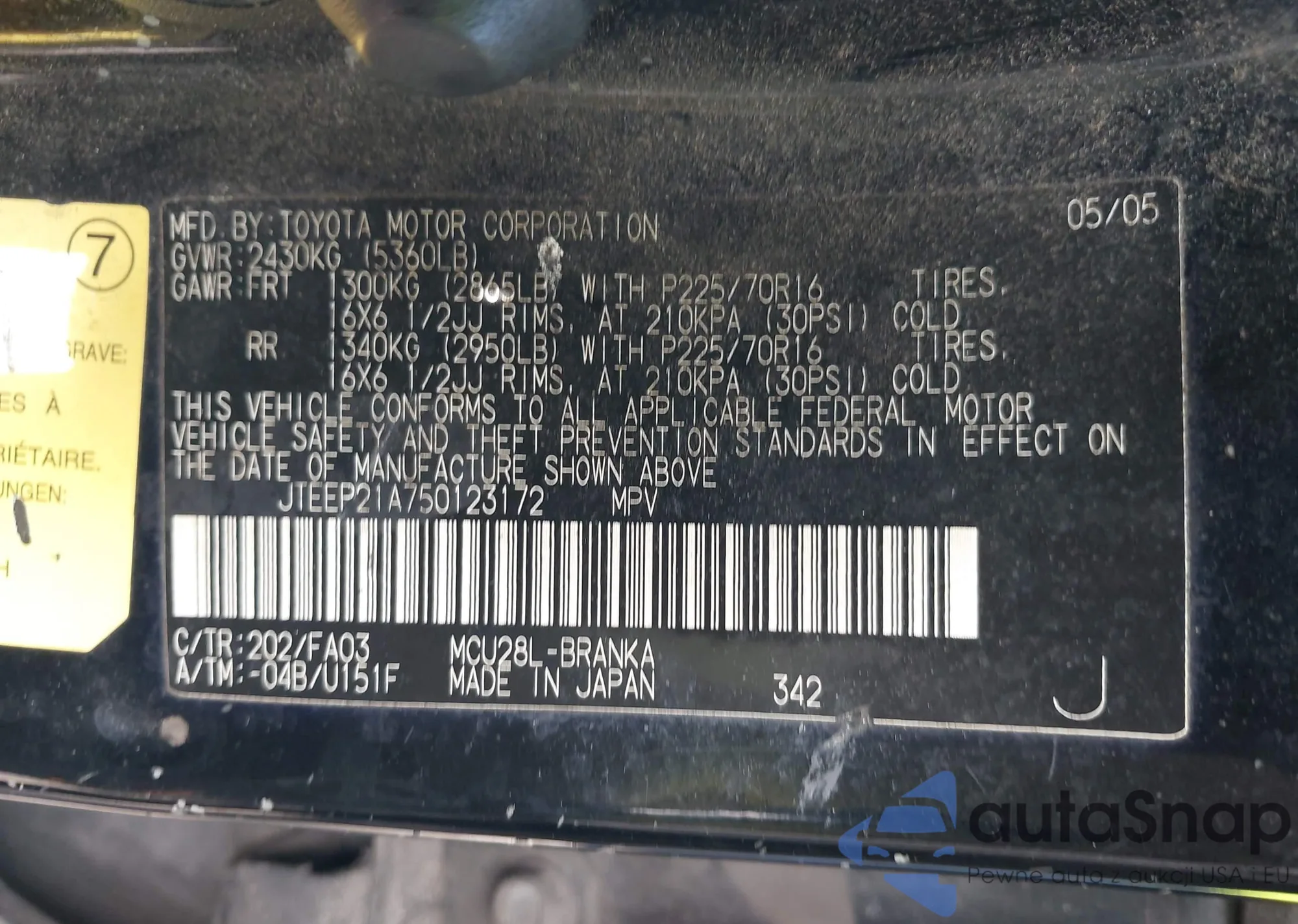 LOT: 42825284 VIN: 2T1BR30E65C416031