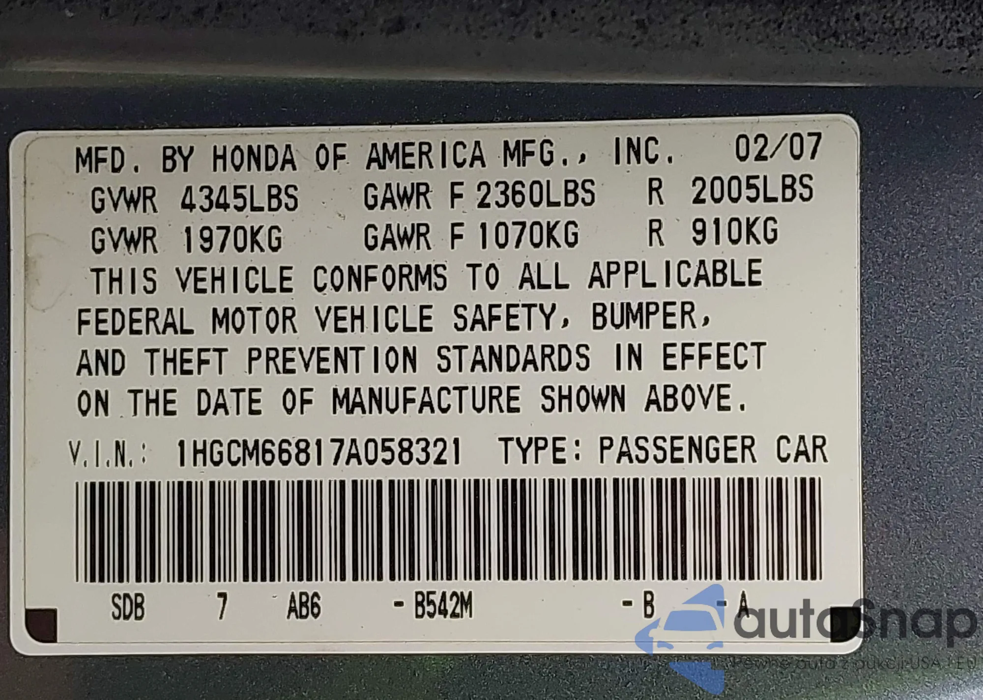 • VIN 1HGCM66817A058321
