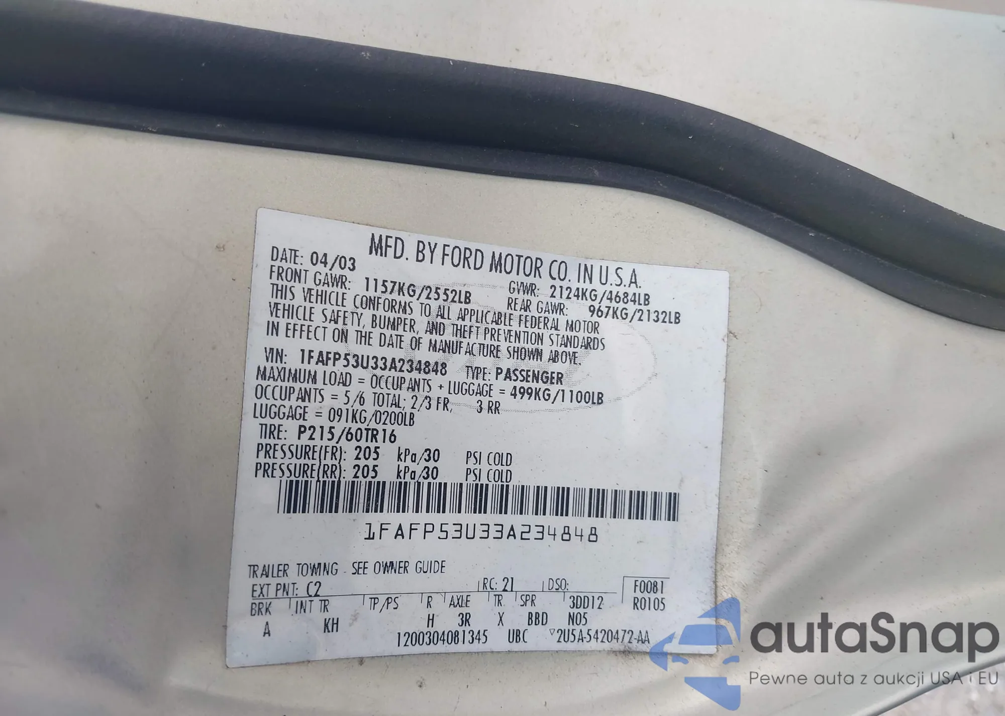 LOT: 42894209 VIN: 1FAFP53U33A234848