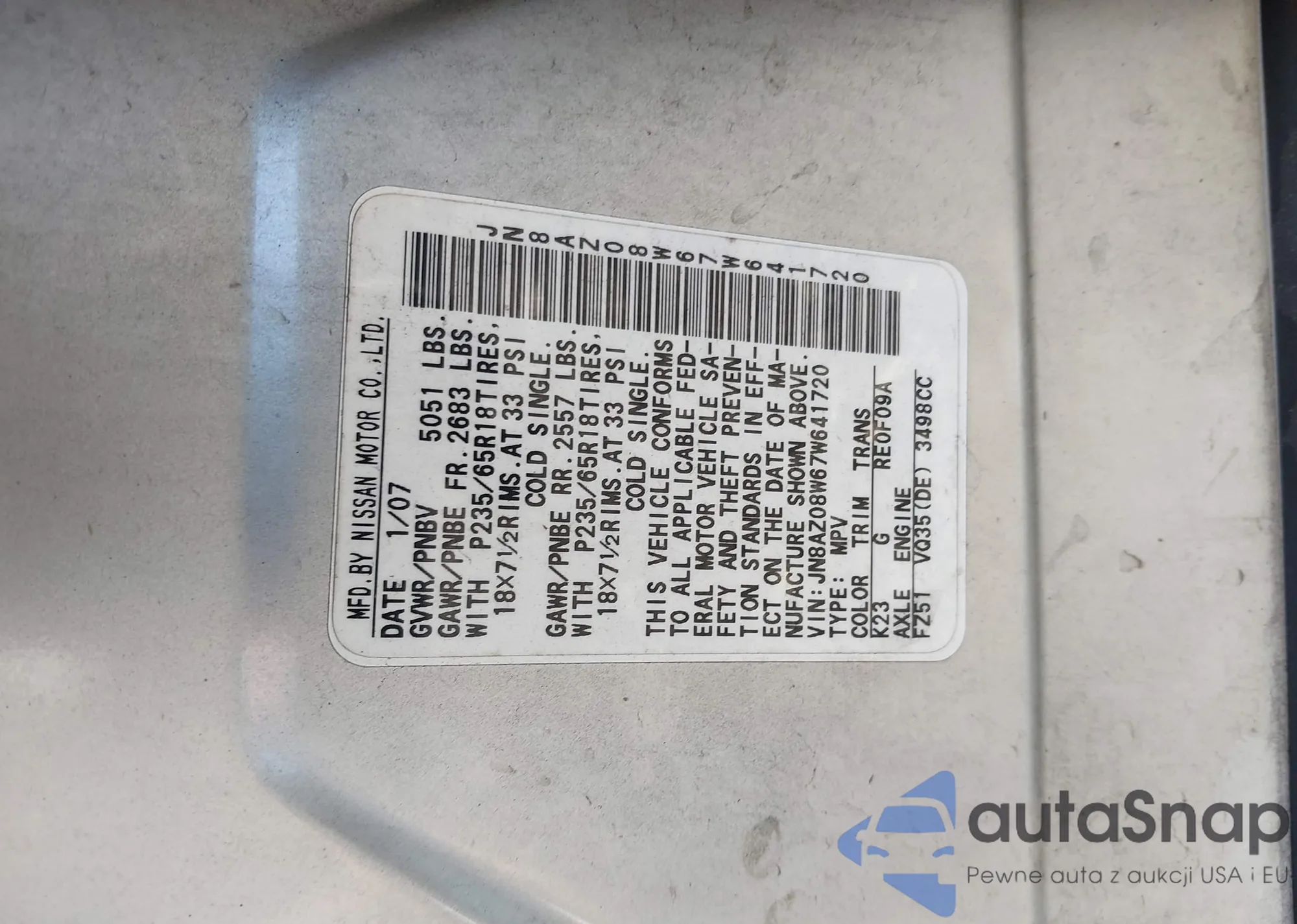 LOT: 42941797 VIN: JN8AZ08W67W641720