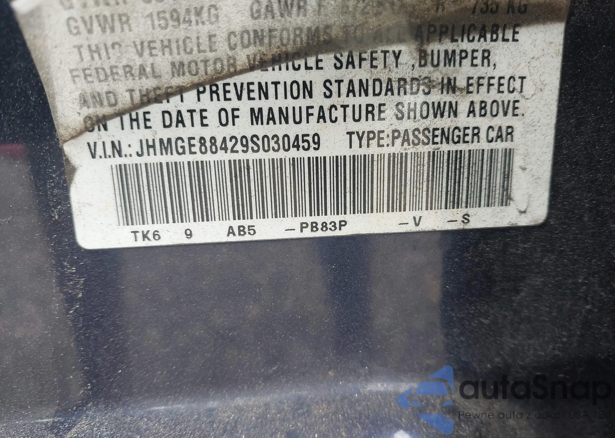 LOT: 42994881 VIN: JHMGE88429S030459