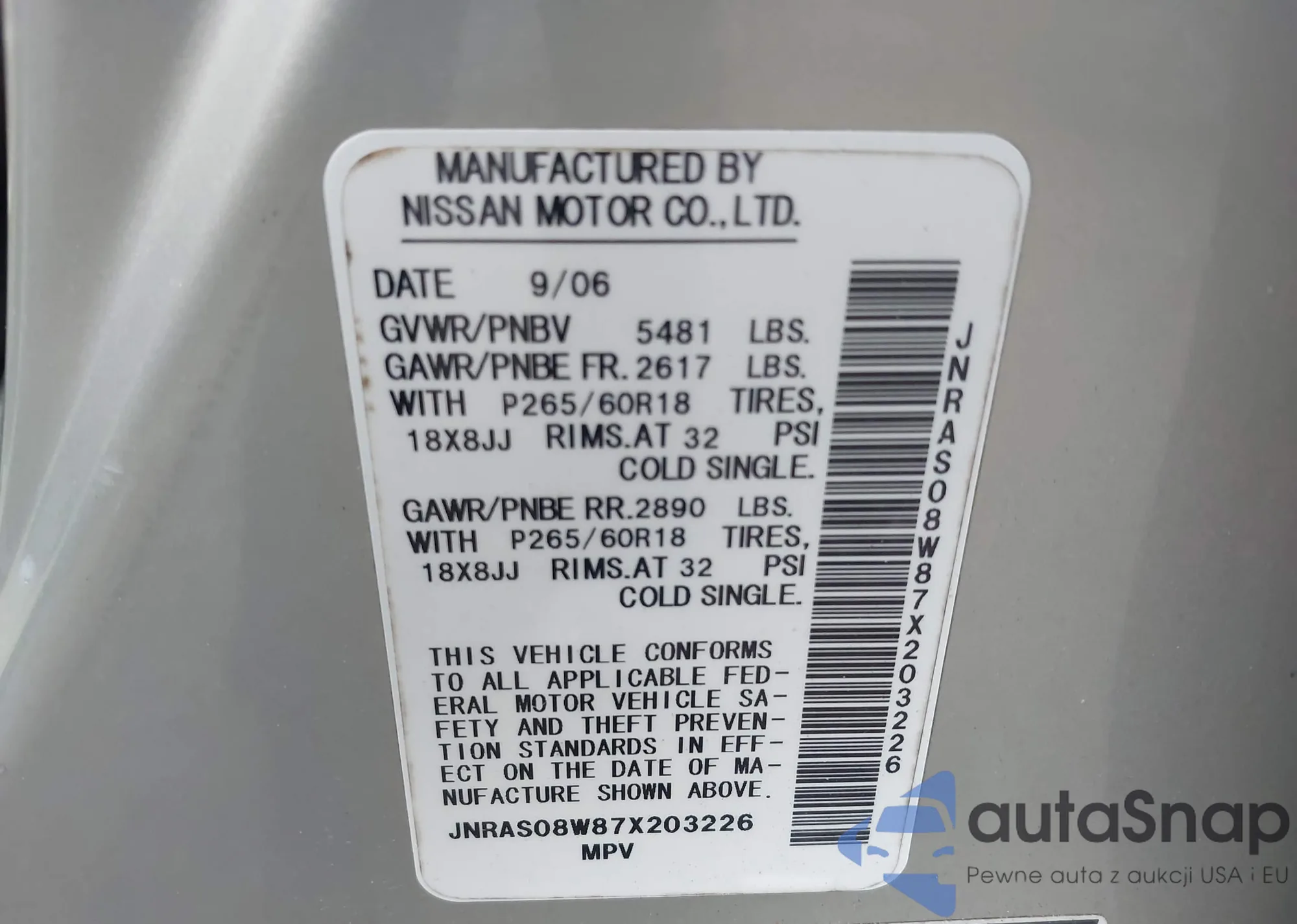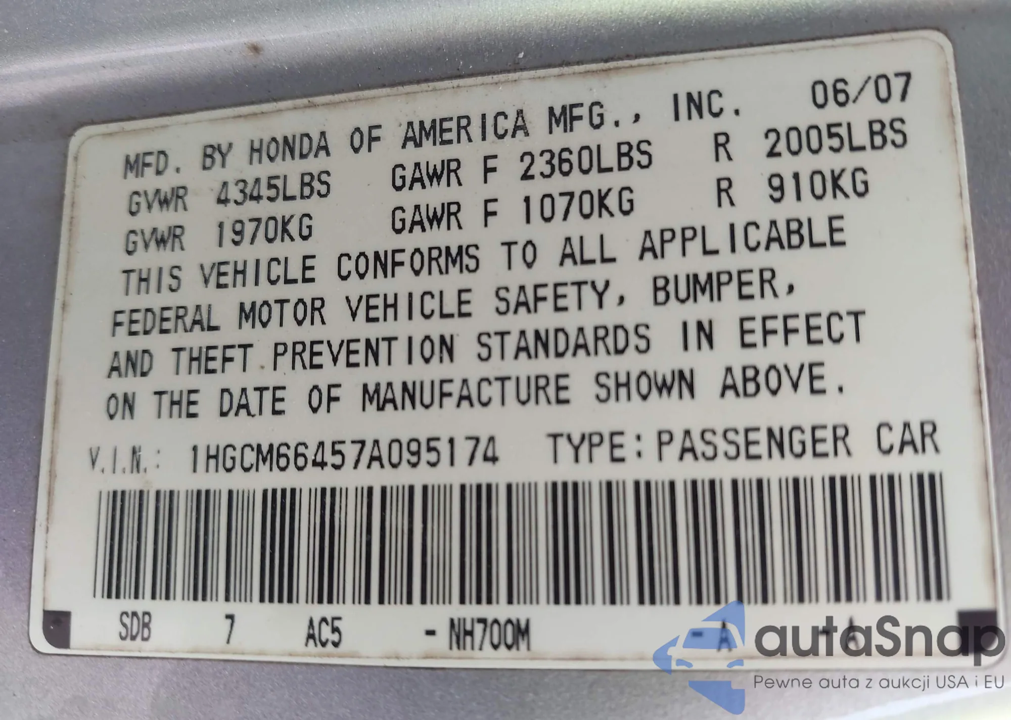 LOT: 42828082 VIN: 1HGCM66457A095174