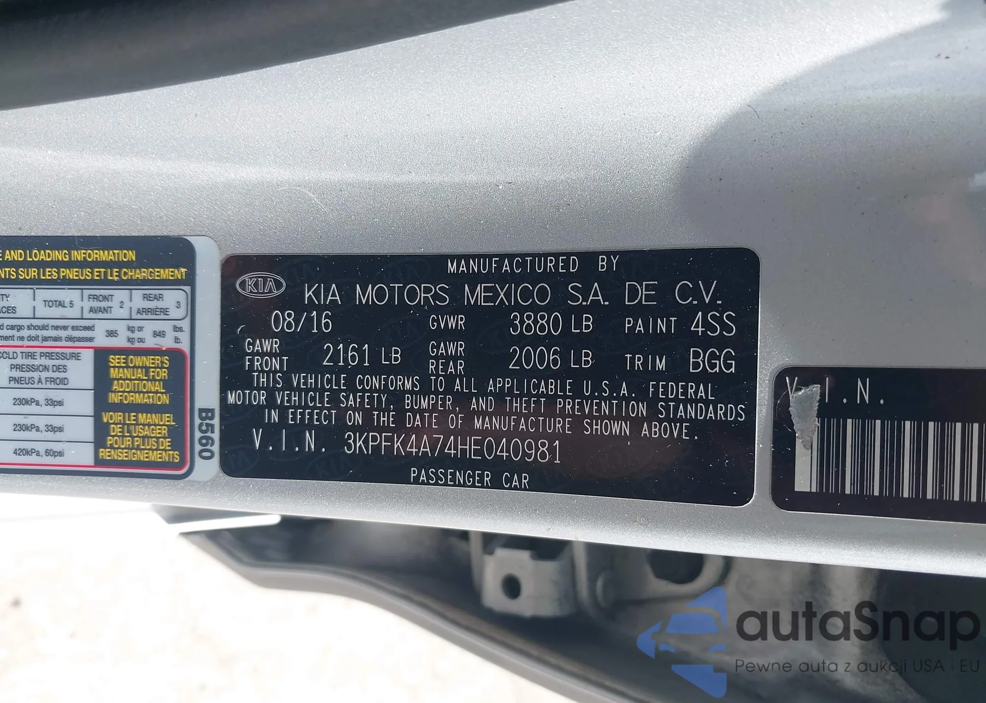 LOT: 42950108 VIN: 3KPFK4A74HE040981