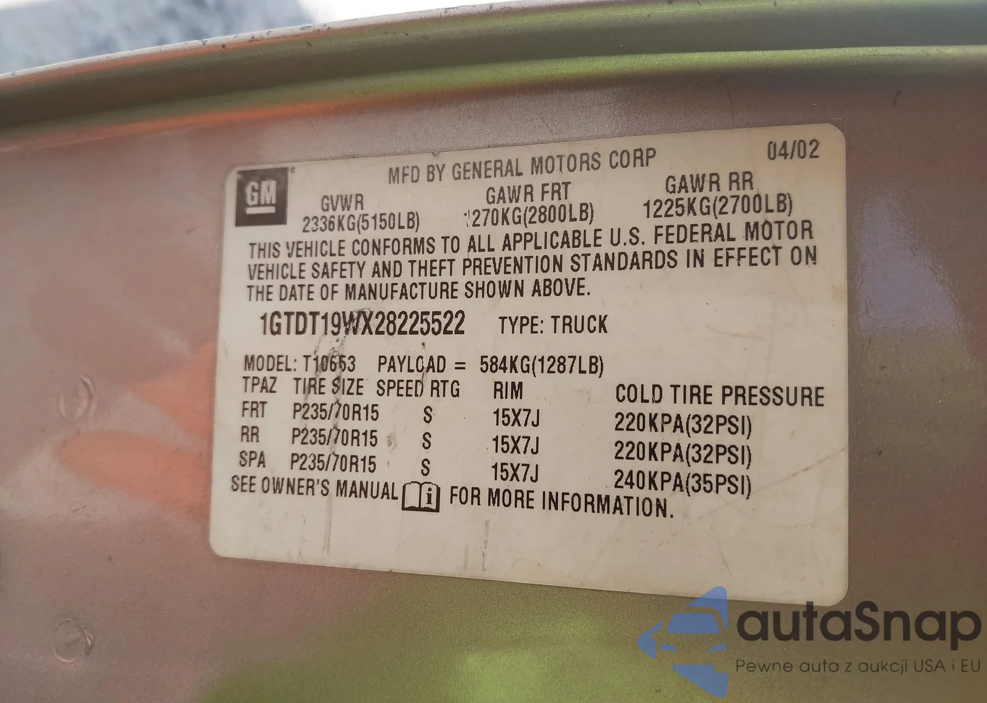 • VIN 1GTDT19WX28225522