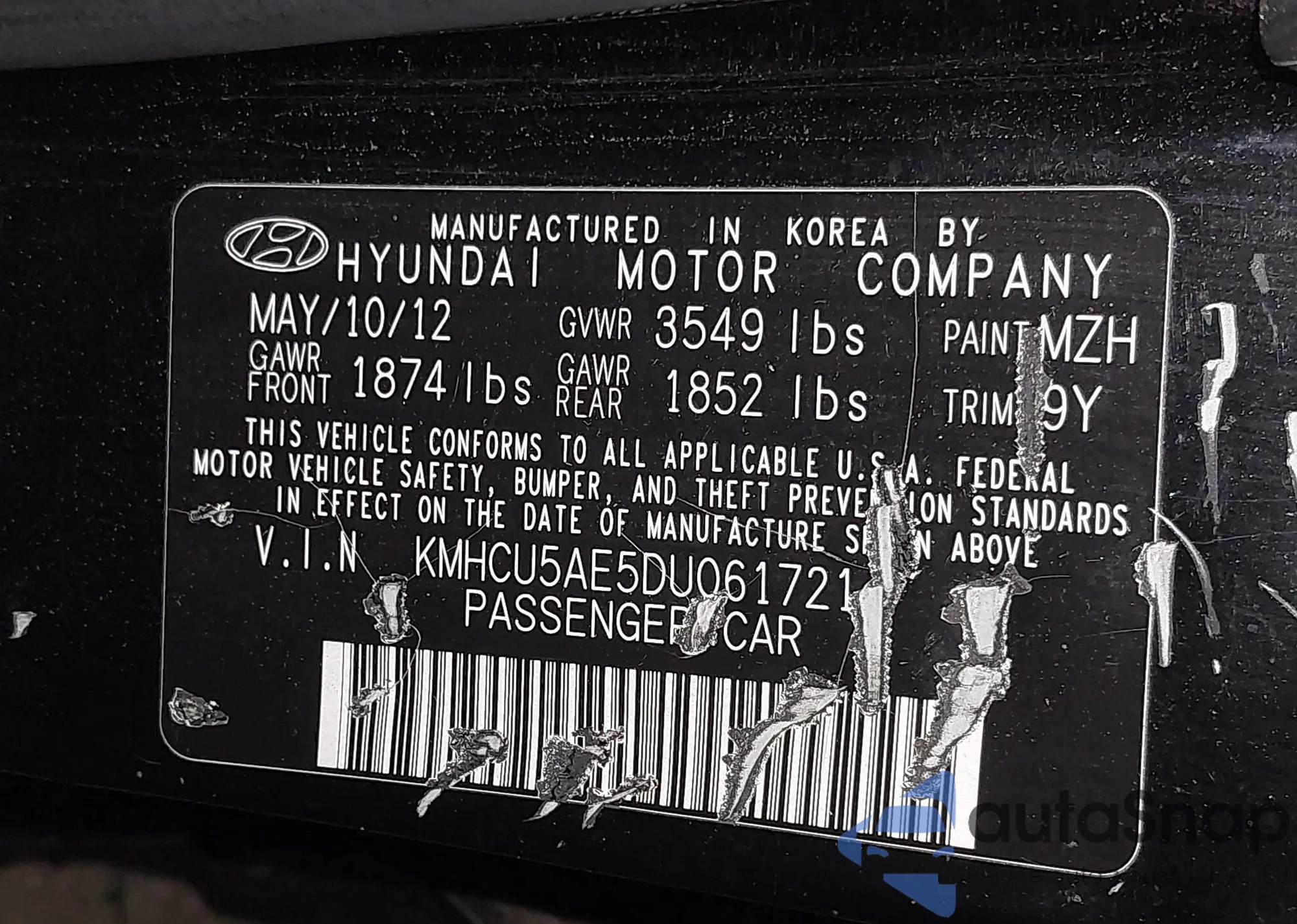 • VIN KMHCU5AE5DU061721