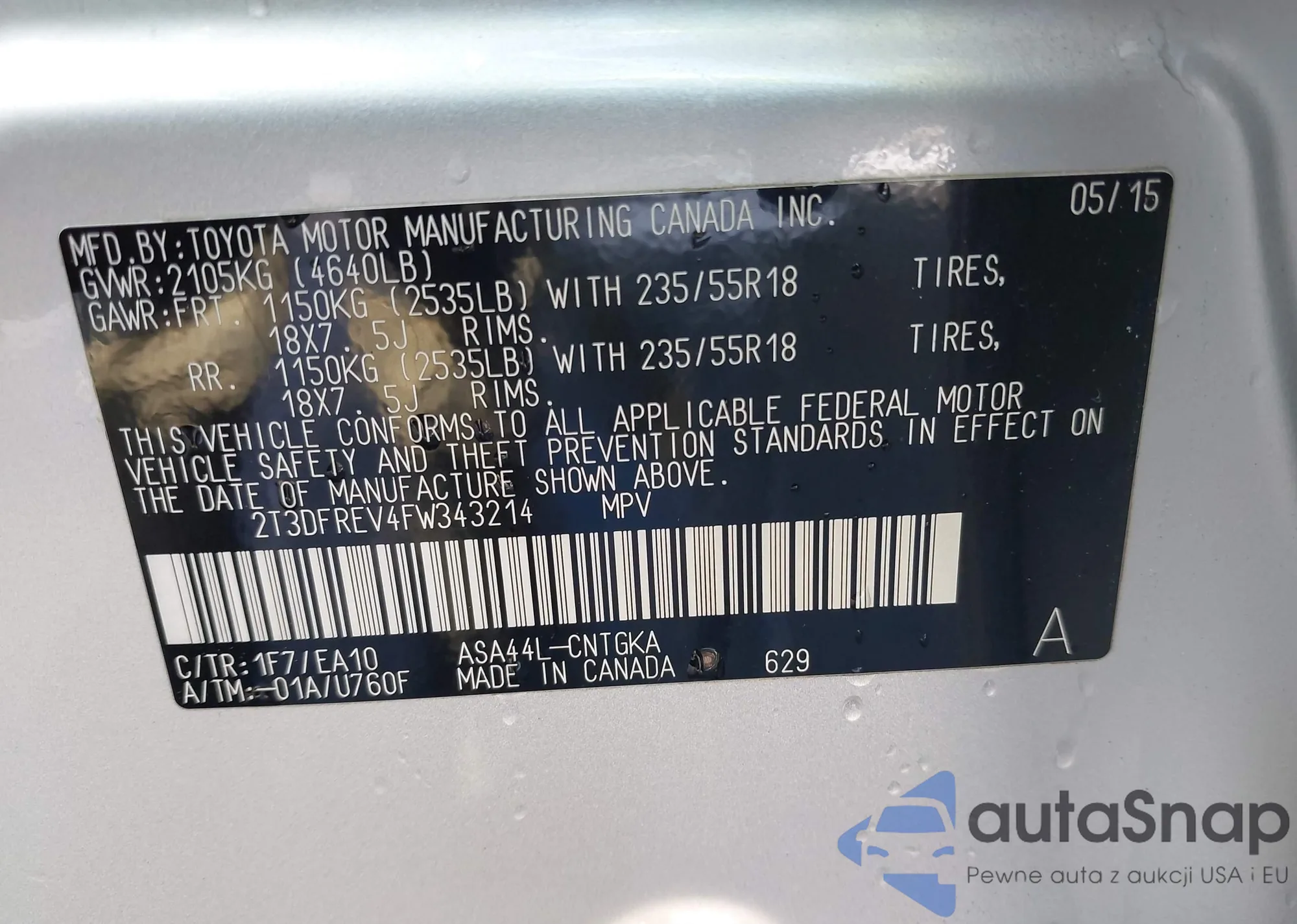 LOT: 43008703 VIN: 2T3DFREV4FW343214