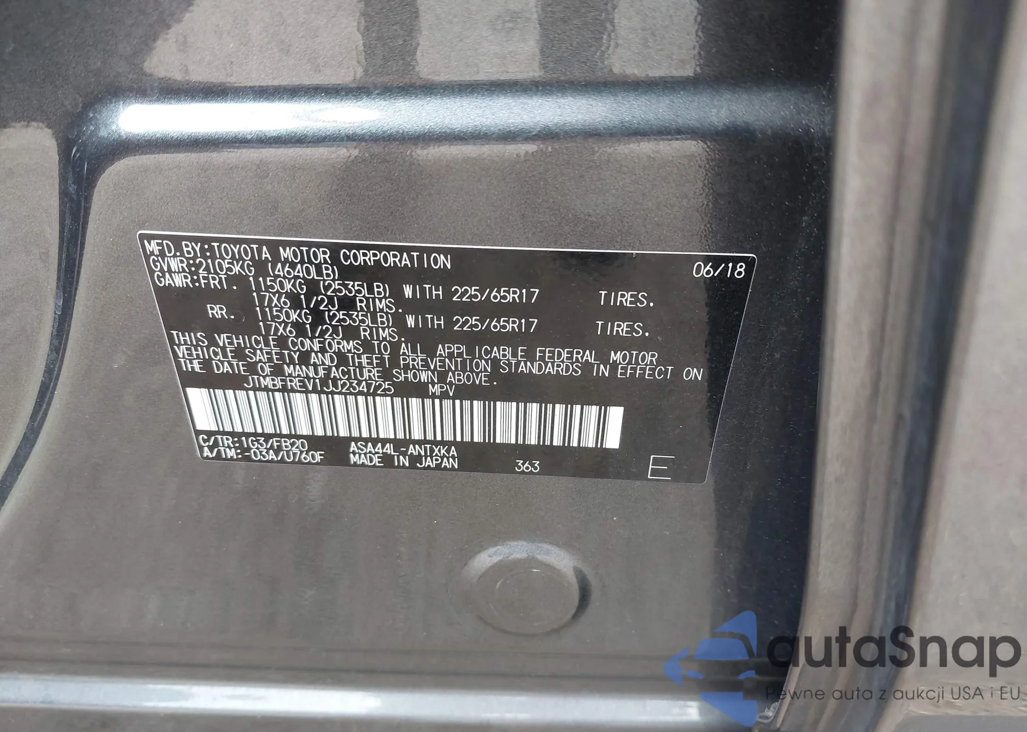 LOT: 42911851 VIN: JTMBFREV1JJ234725
