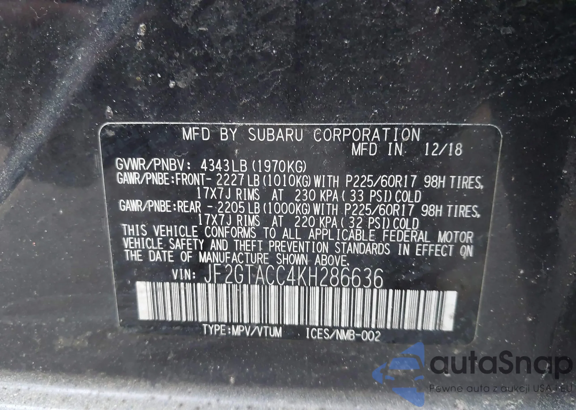 • VIN JF2GTACC4KH286636