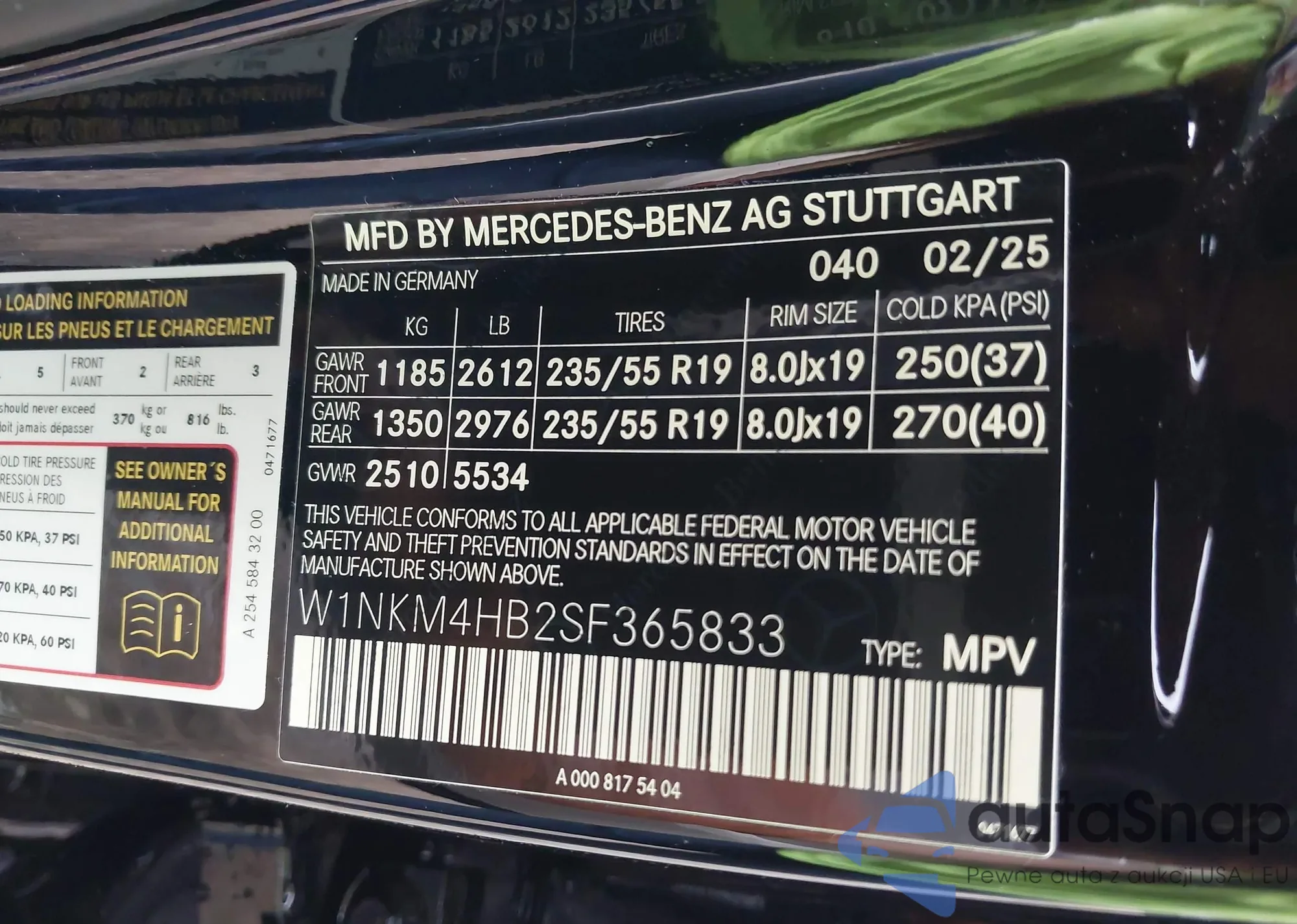 • VIN W1NKM4HB2SF365833