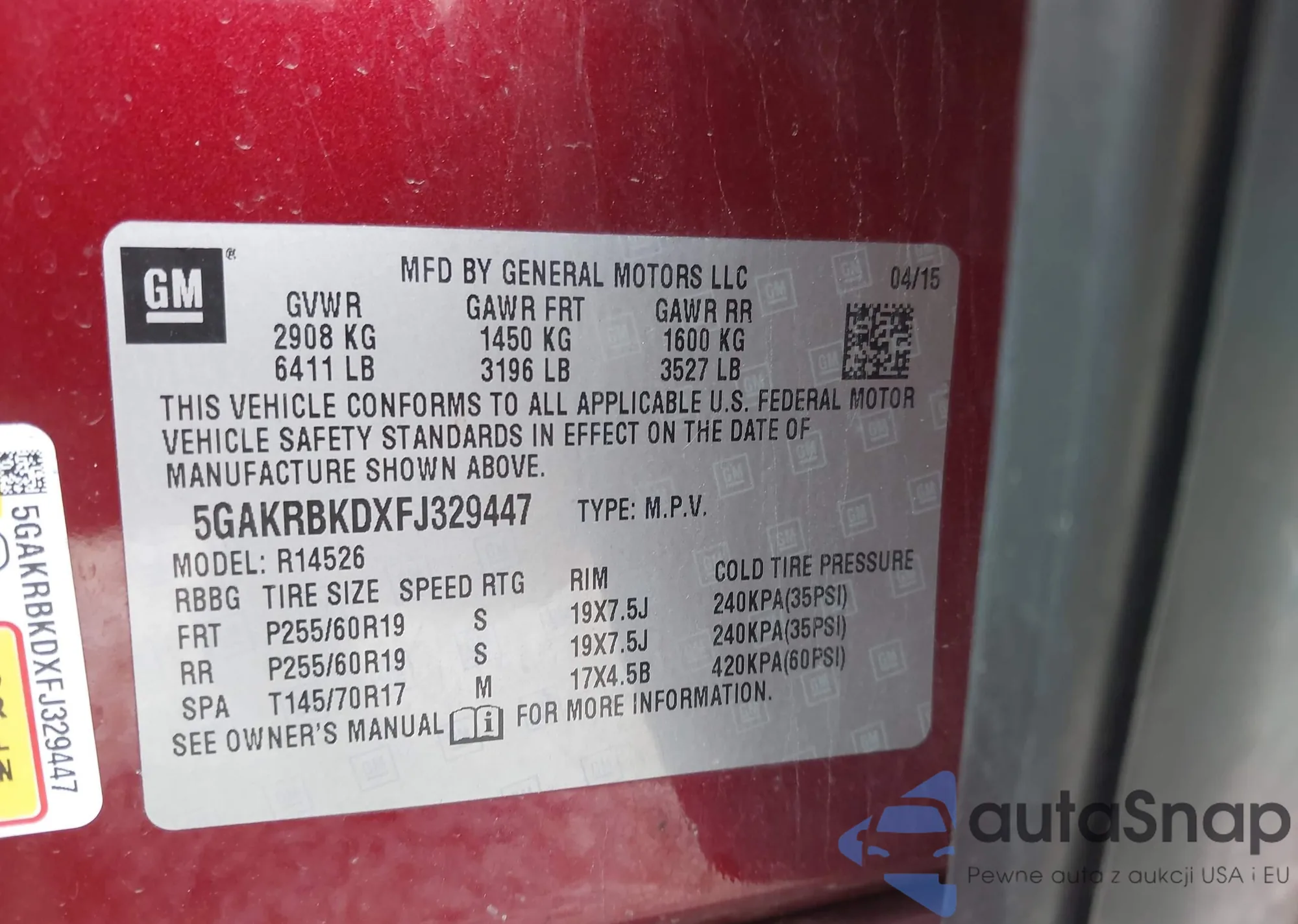 LOT: 42560572 VIN: 5GAKRBKDXFJ329447