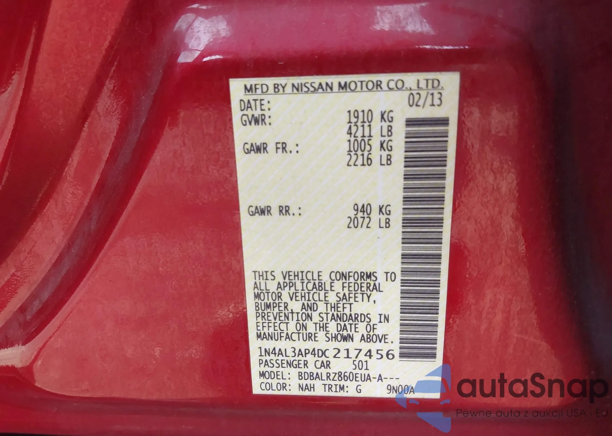 LOT: 42802501 VIN: 1N4AL3AP4DC217456