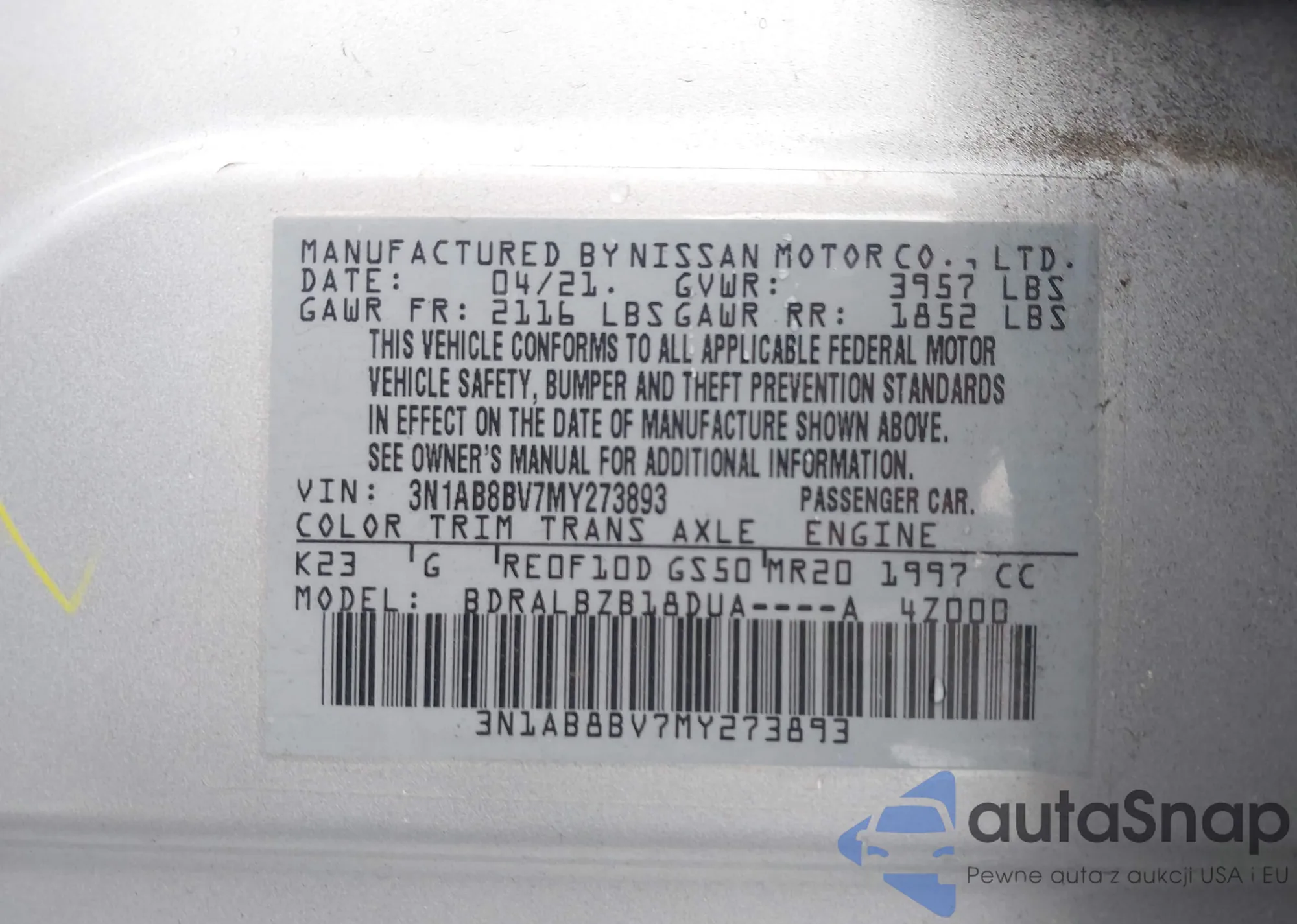 • VIN 3N1AB8BV7MY273893