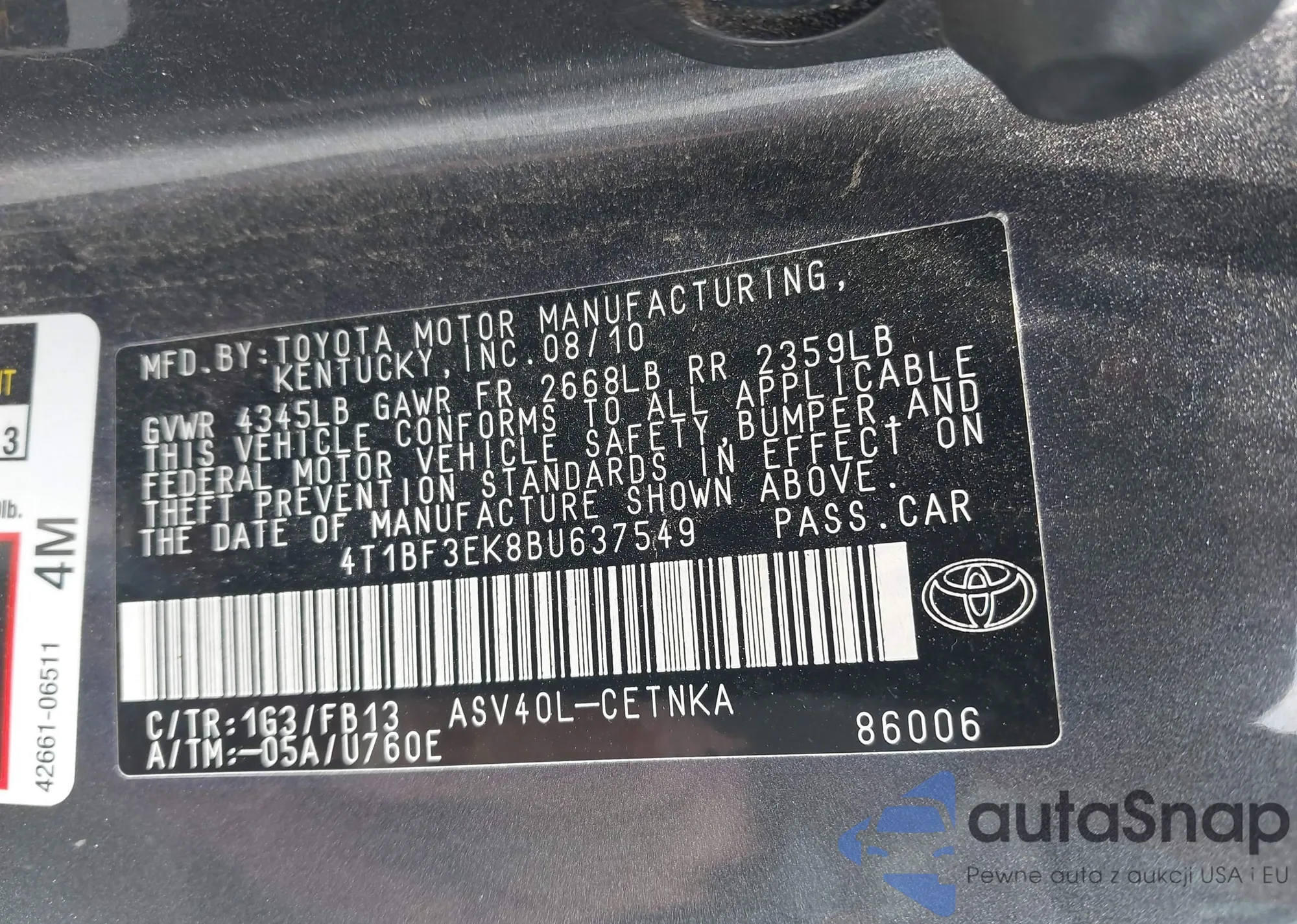• VIN 4T1BF3EK8BU637549