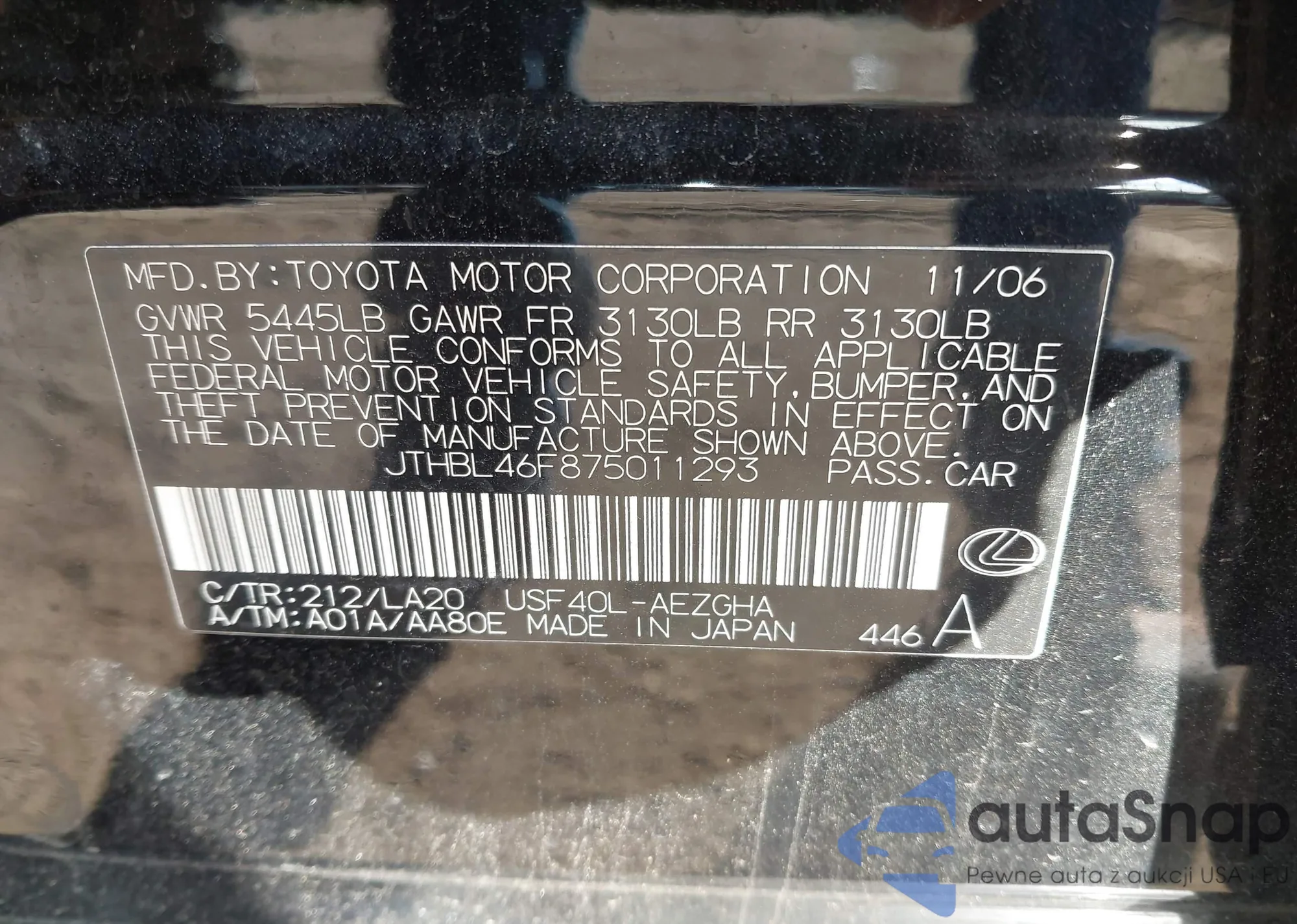 LOT: 43109450 VIN: JTHBL46F875011293