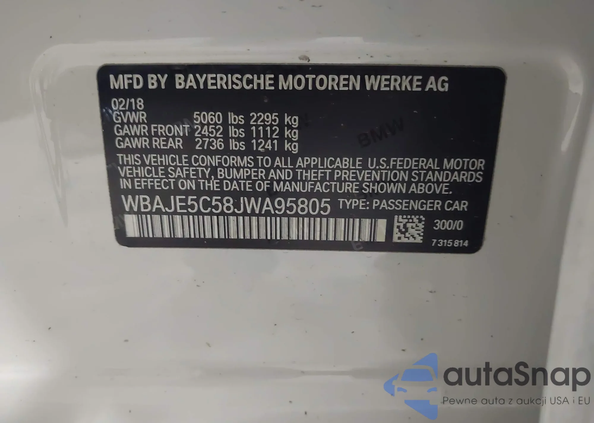 LOT: 42796501 VIN: WBAJE5C58JWA95805