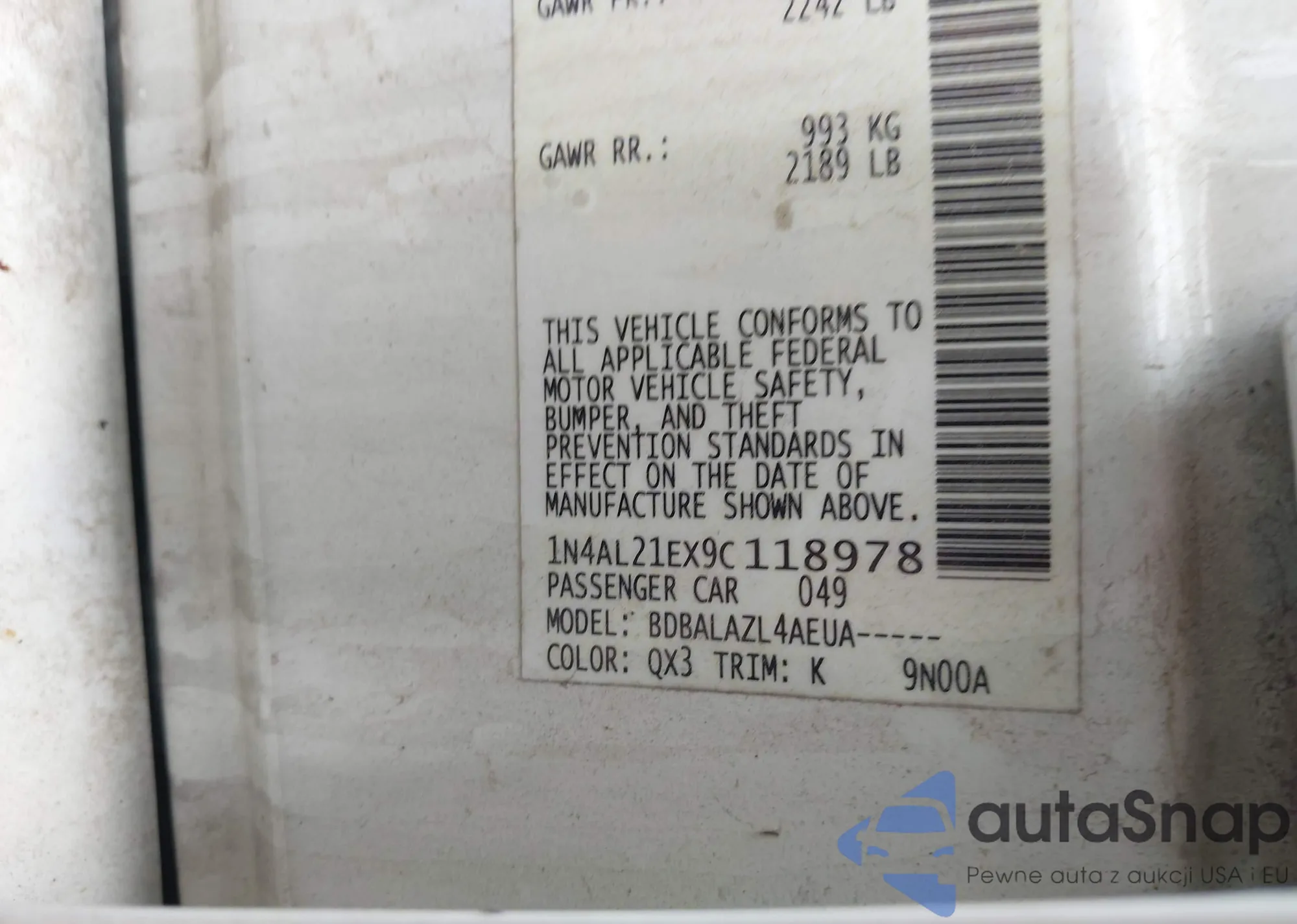• VIN 1N4AL21EX9C118978