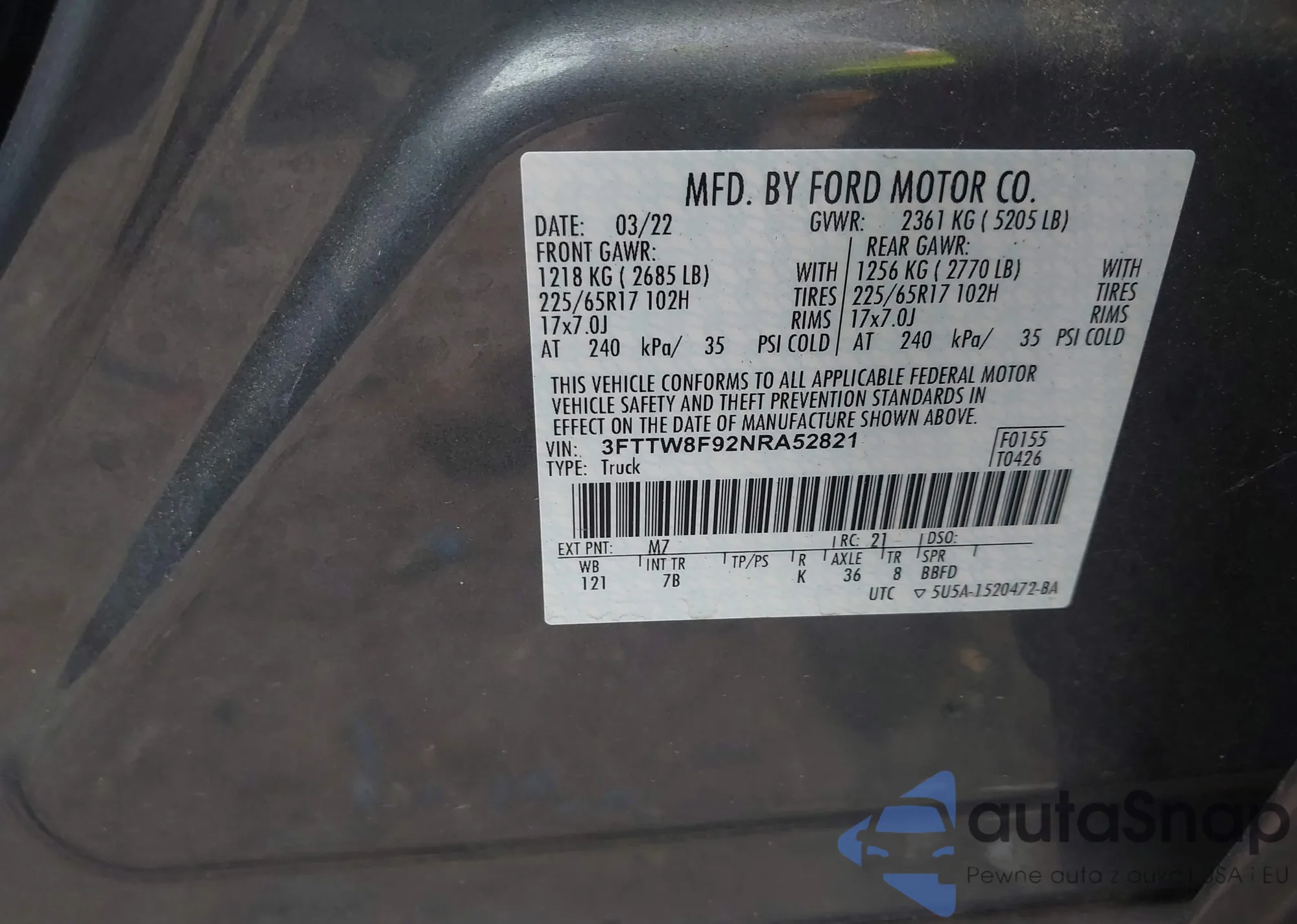 LOT: 42876519 VIN: 3FTTW8F92NRA52821