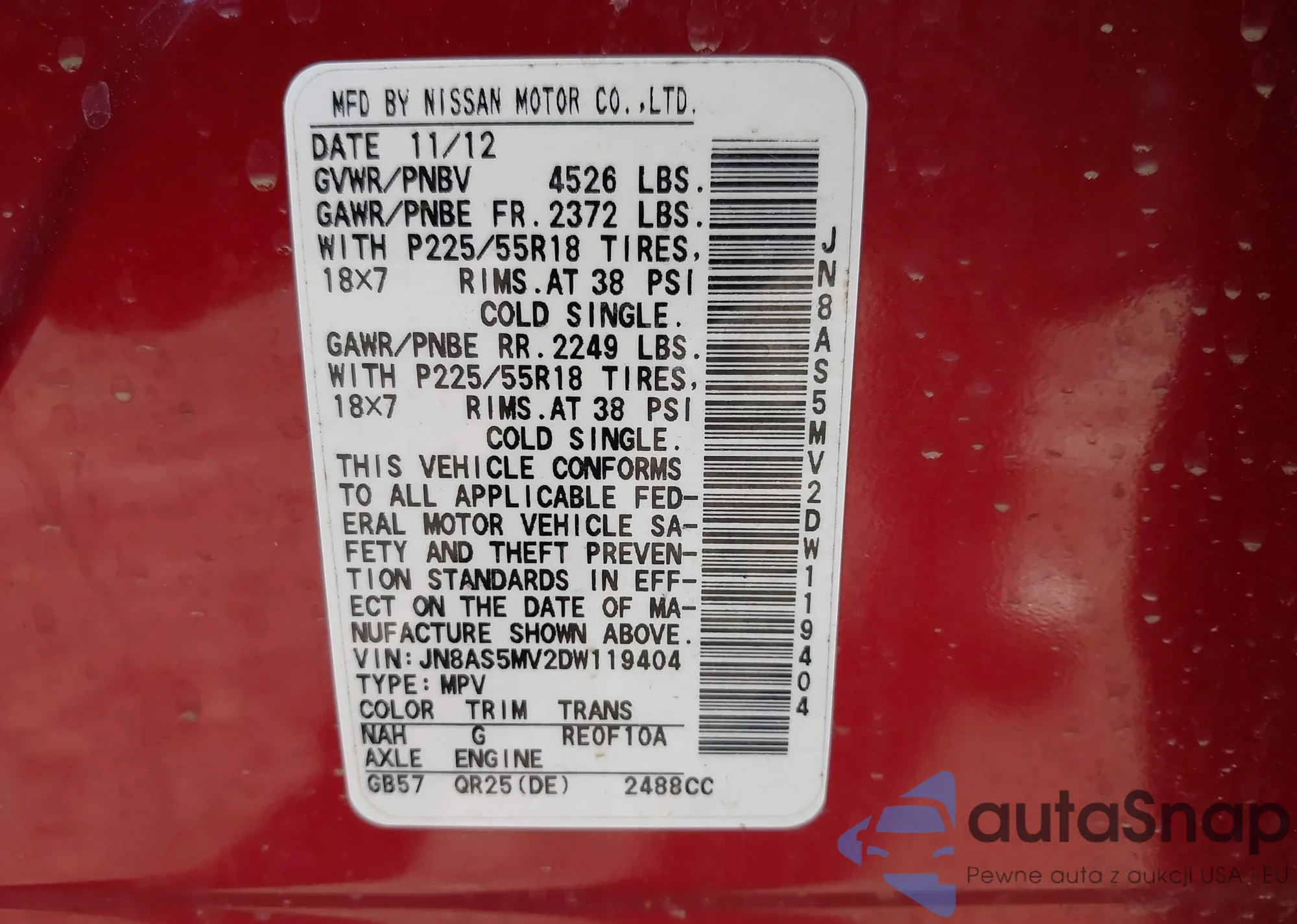 LOT: 43065055 VIN: JN8AS5MV2DW119404