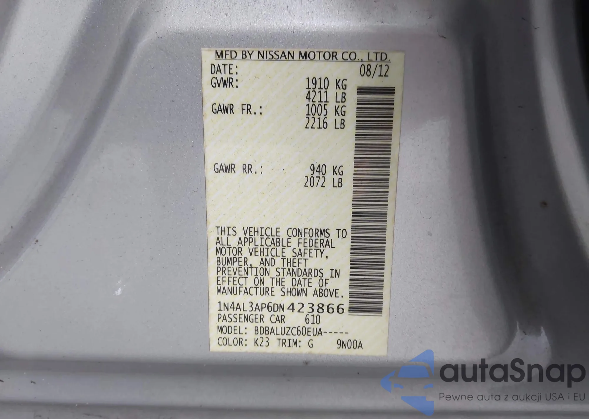 LOT: 42936668 VIN: 1N4AL3AP6DN423866