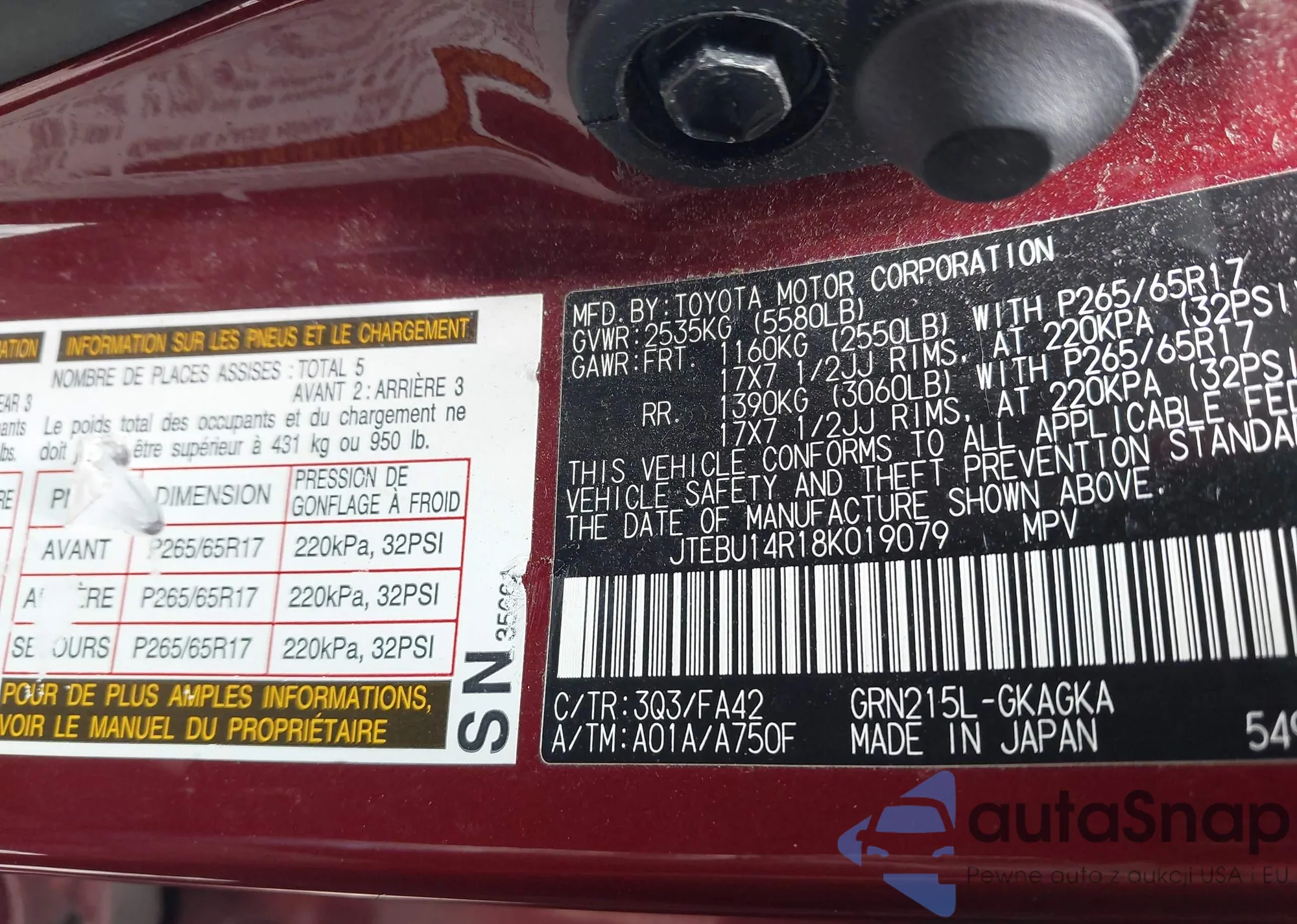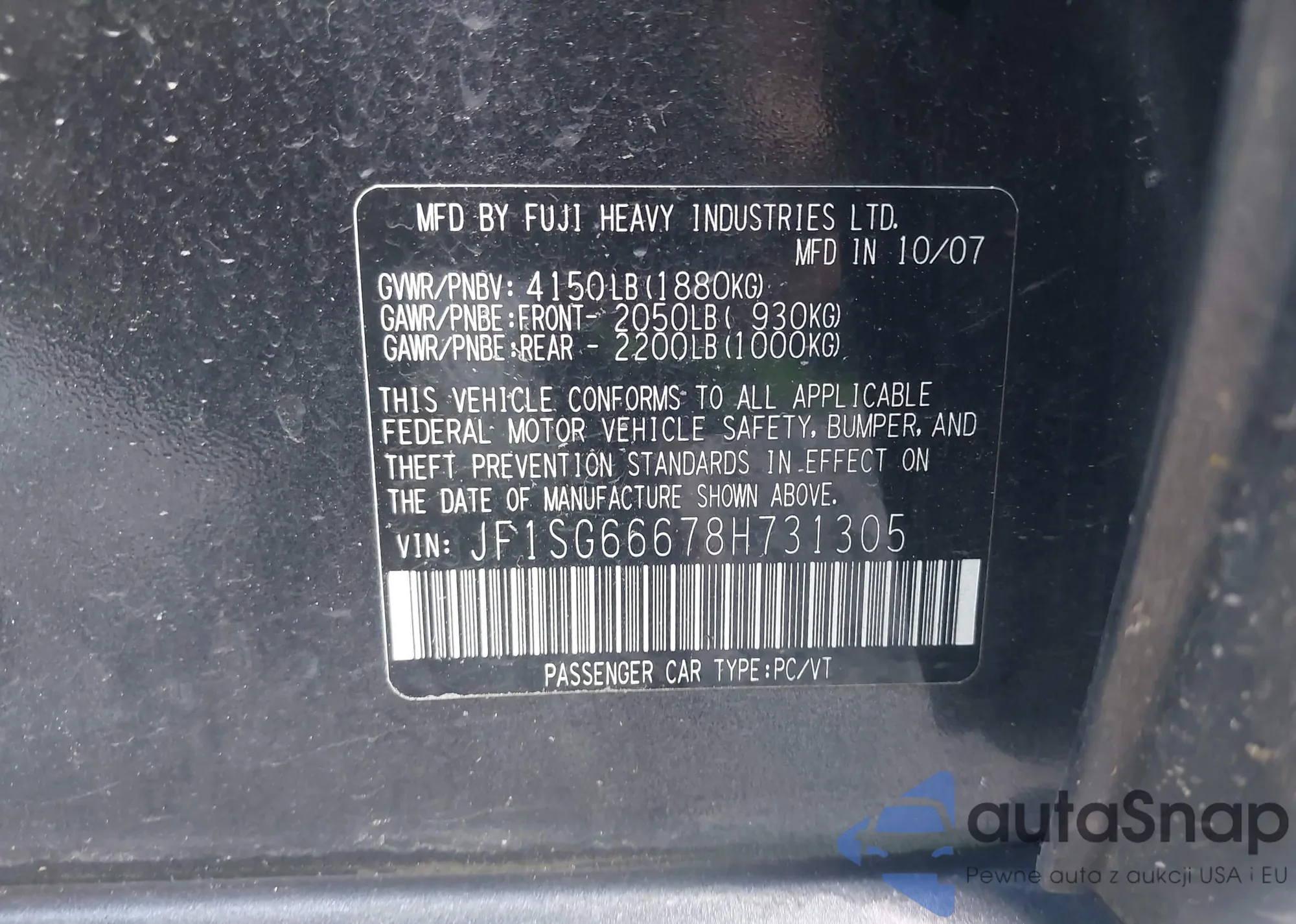 LOT: 42706044 VIN: JF1SG66678H731305
