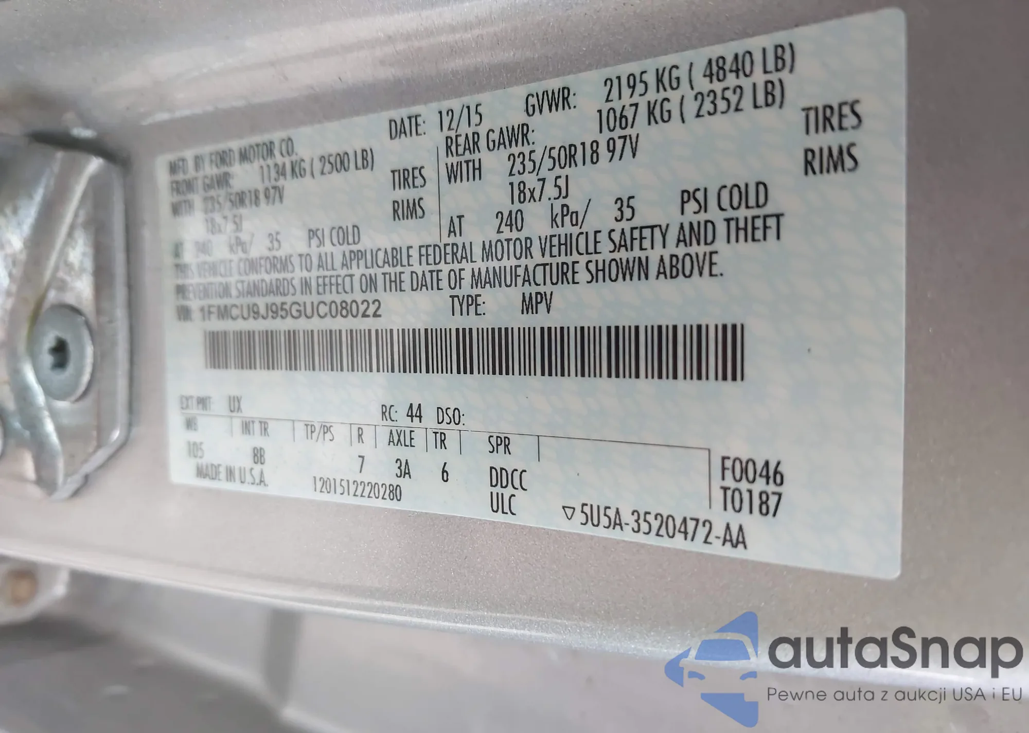 LOT: 43032591 VIN: 1FMCU9J95GUC08022