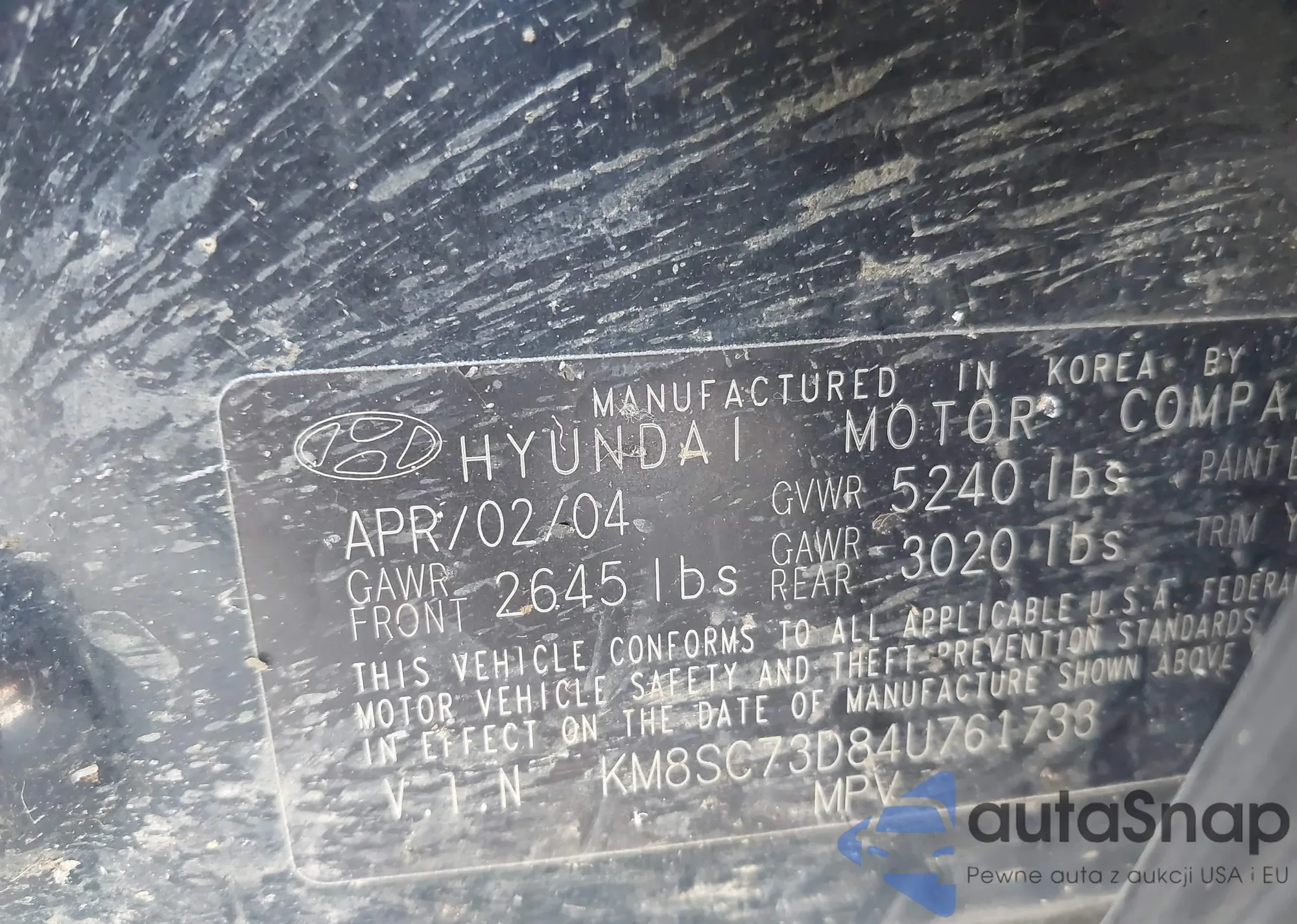 LOT: 42867724 VIN: KM8SC73D84U761733